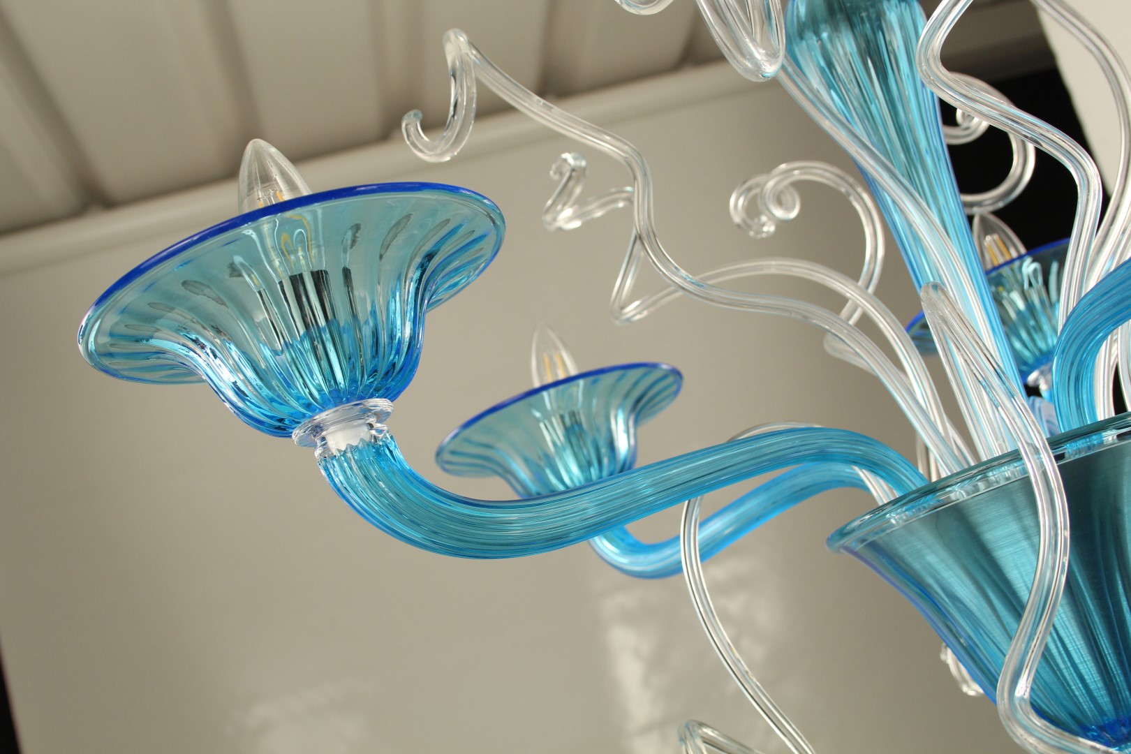Luxury Chandelier in blue clear glass with particular blown crystall finitures.