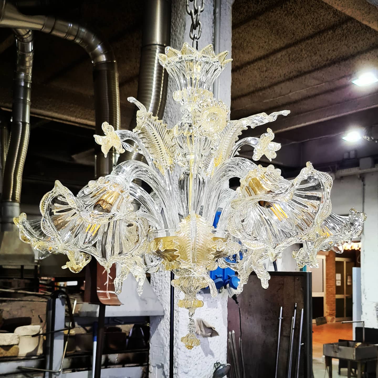 The chandelier is handmade according to the old Murano glass tradition, handcrafted in crystal glass.