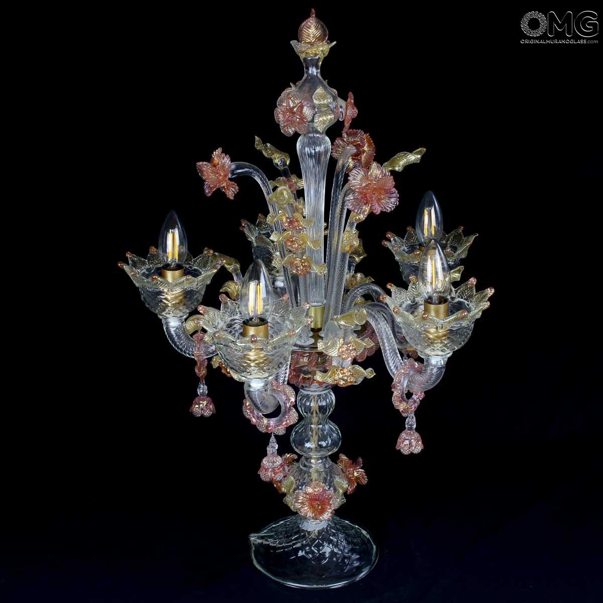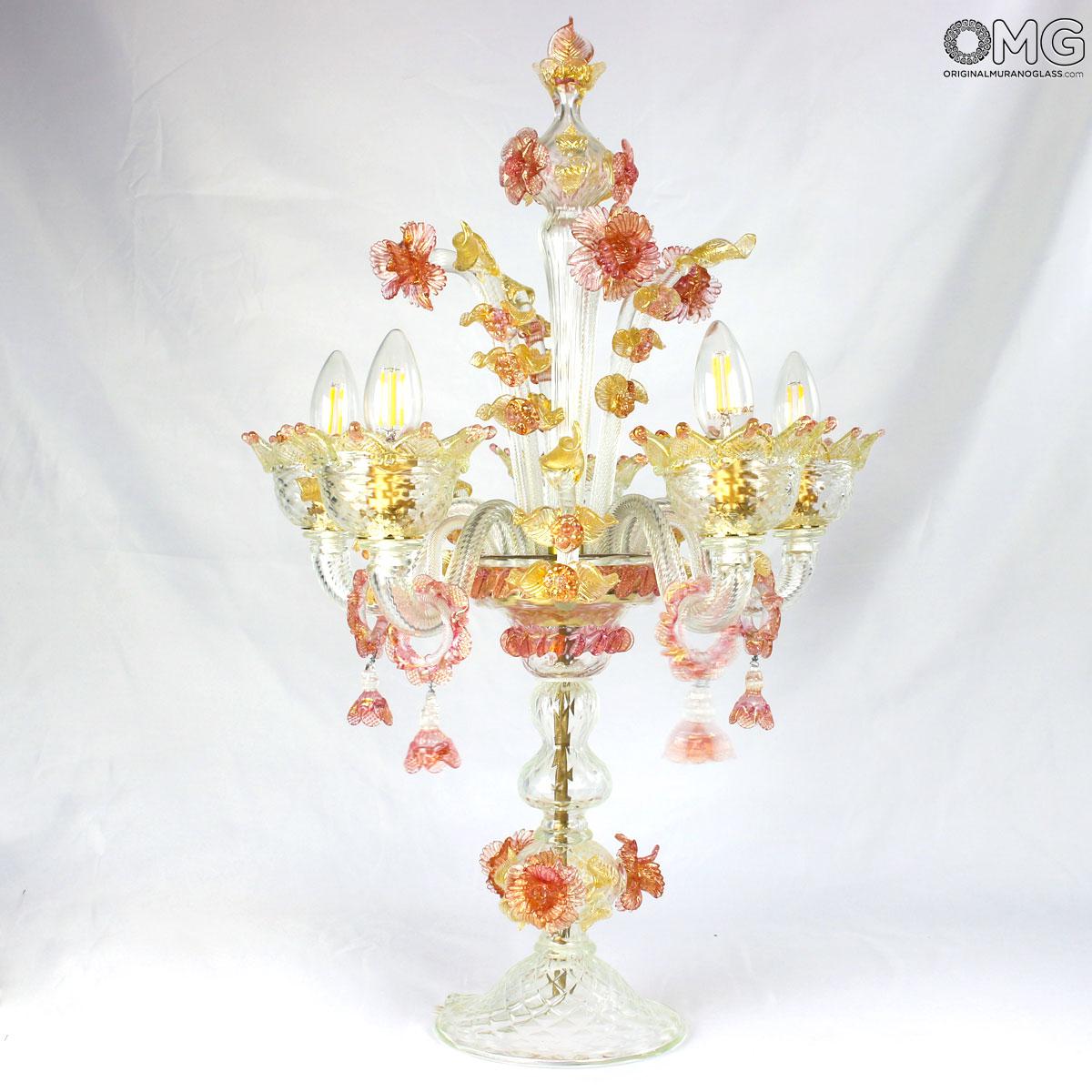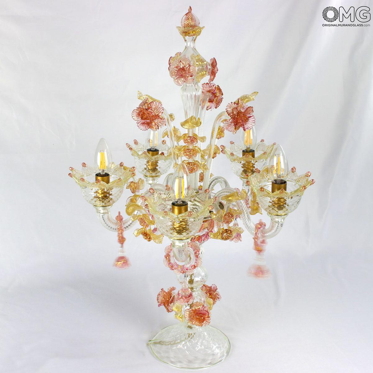 Flambeau 5 lights, Venetian glass transparent with pink trim and gold. Flambeau handmade according with the old Murano glass tradition, handcrafted in blown glass.