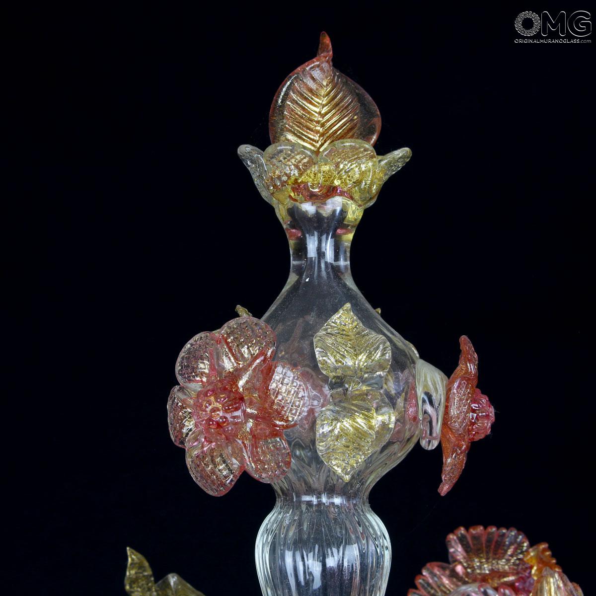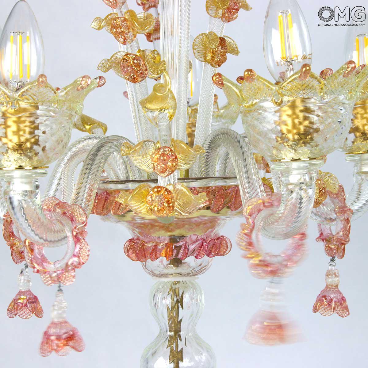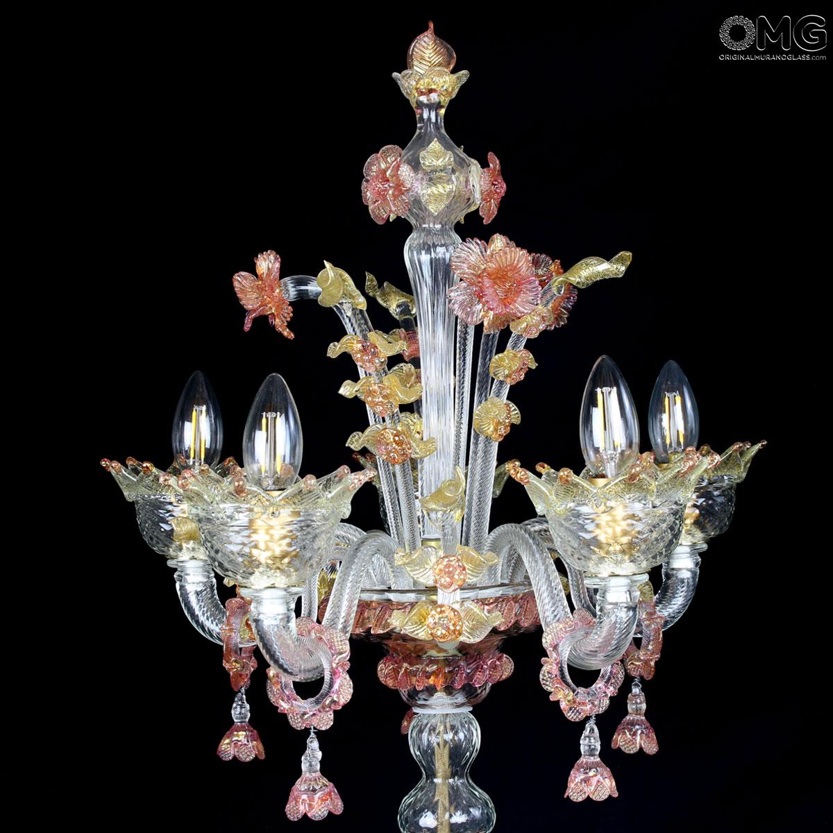 Flambeau 5 lights, Venetian glass transparent with pink trim and gold. Flambeau handmade according with the old Murano glass tradition, handcrafted in blown glass.