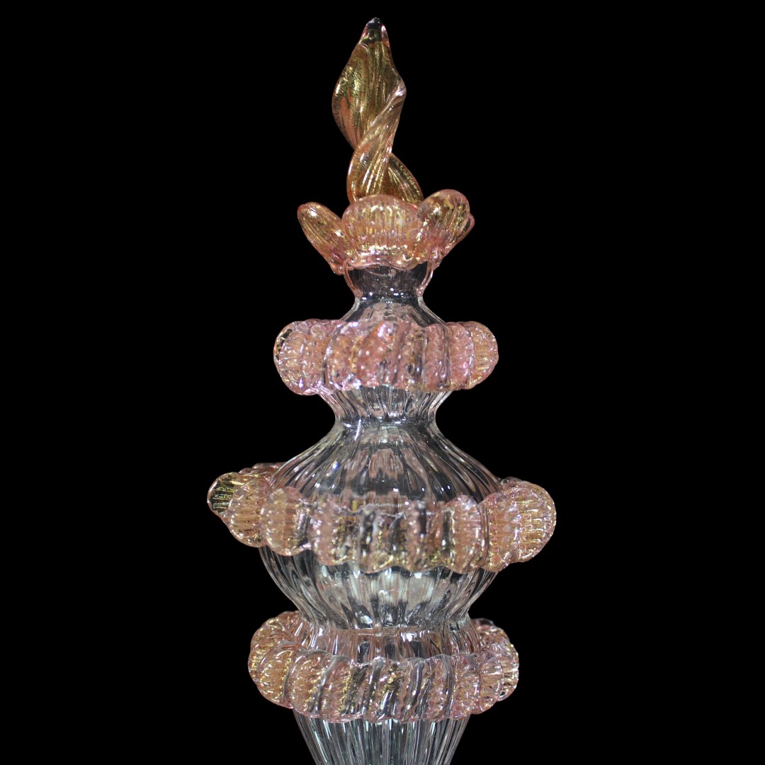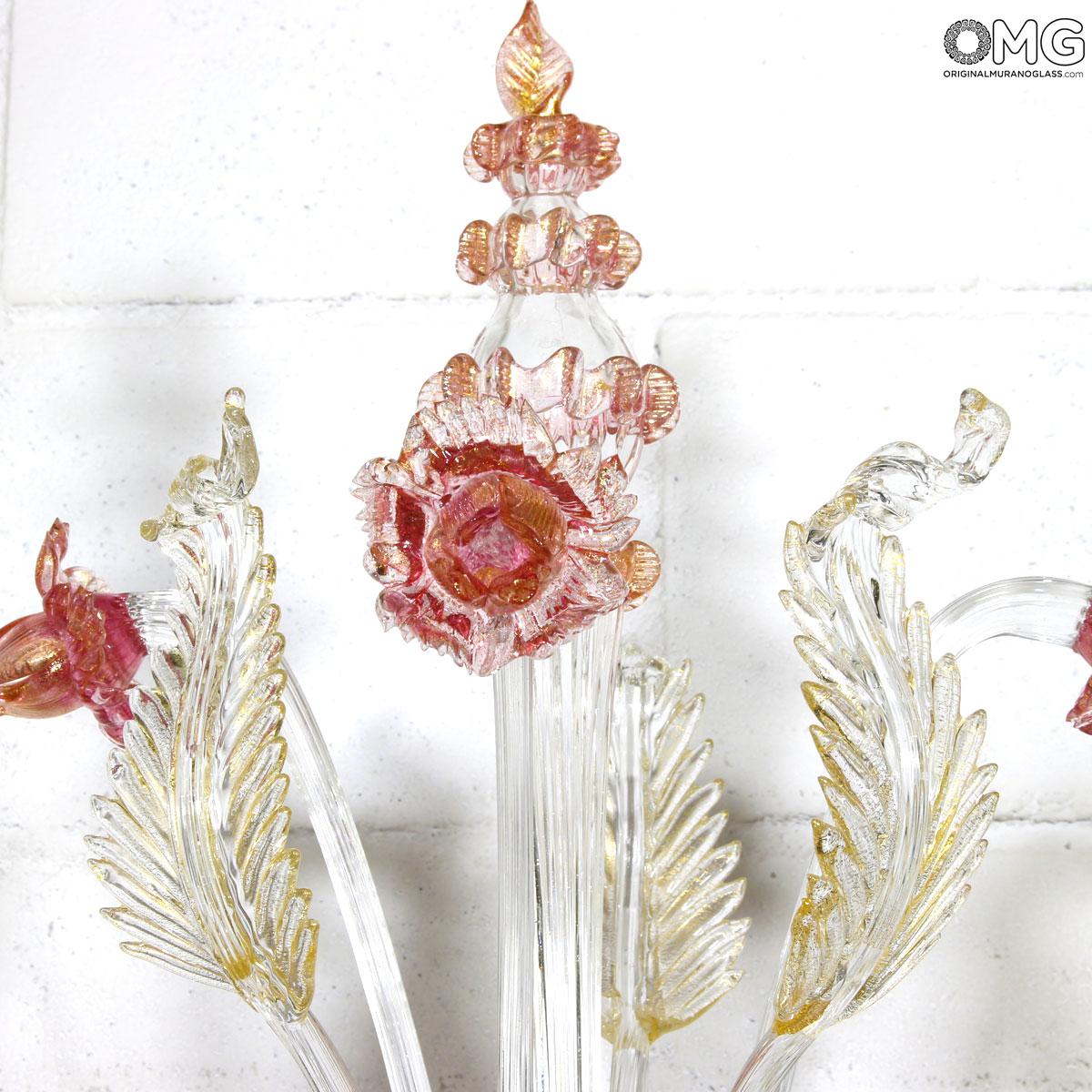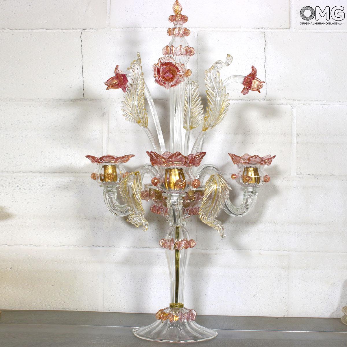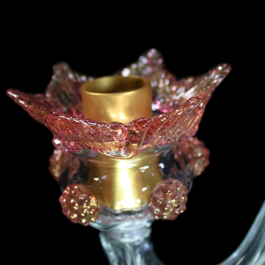 Flambeau 3 lights, Venetian glass transparent with pink trim and gold. Flambeau handmade according with the old Murano glass tradition, handcrafted in blown glass.