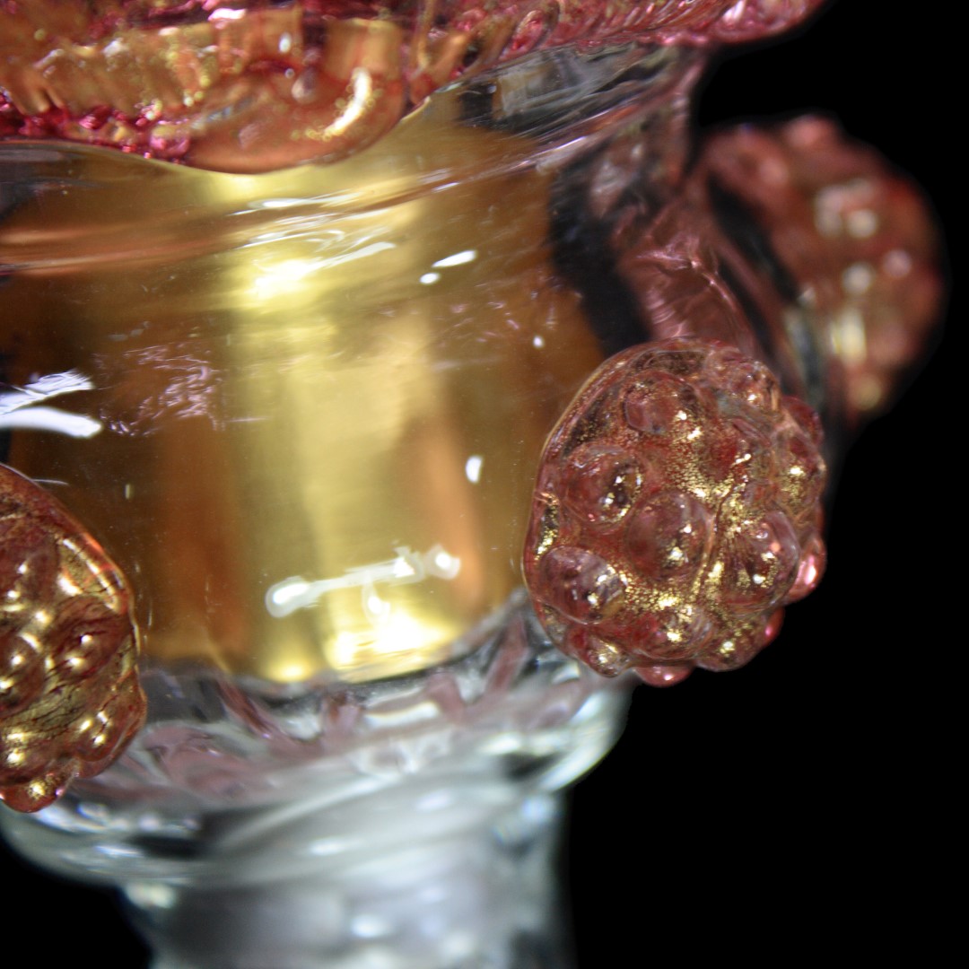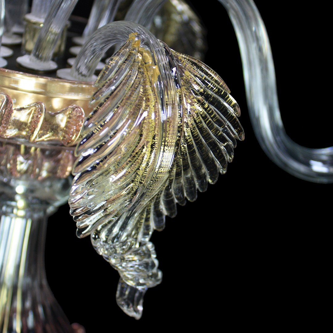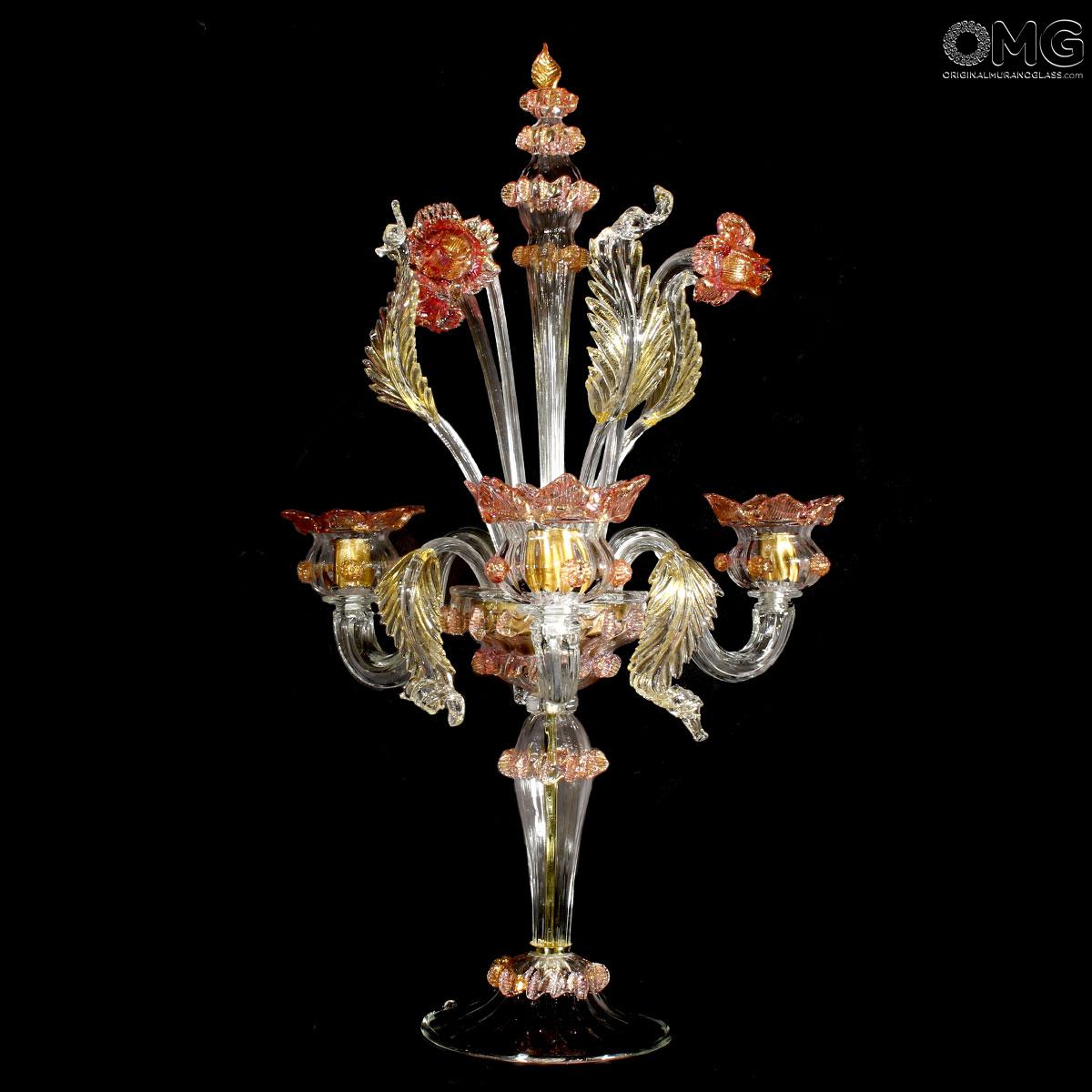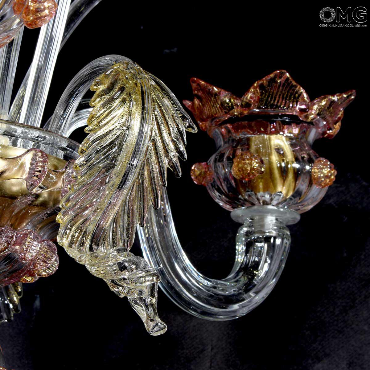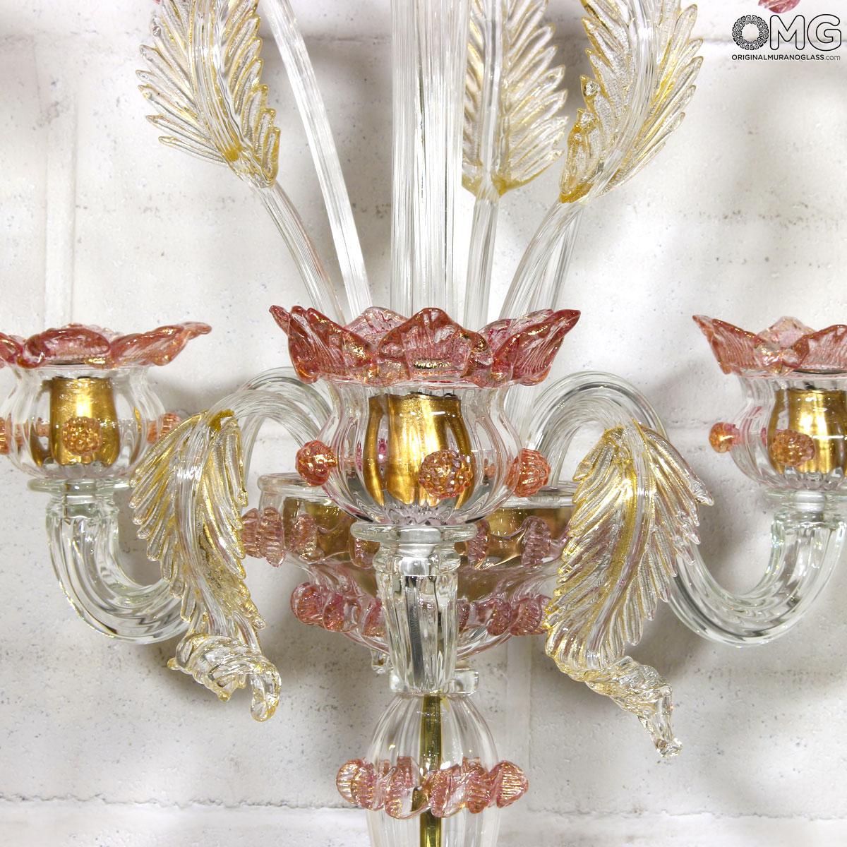 Flambeau 3 lights, Venetian glass transparent with pink trim and gold. Flambeau handmade according with the old Murano glass tradition, handcrafted in blown glass.