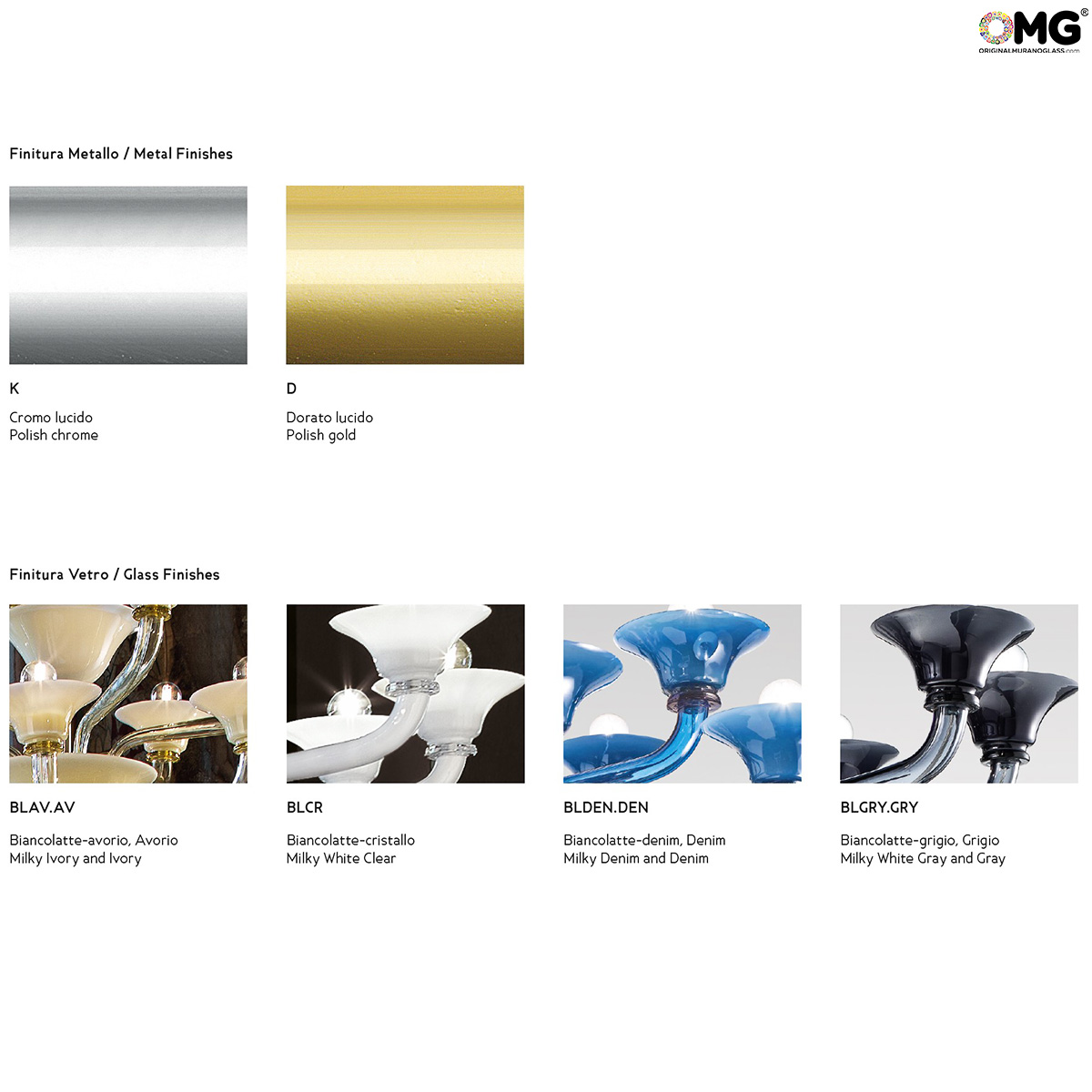 Lights number, dimensions, glass colors and metal finishes of the chandelier could vary, please look at pictures description for all details.