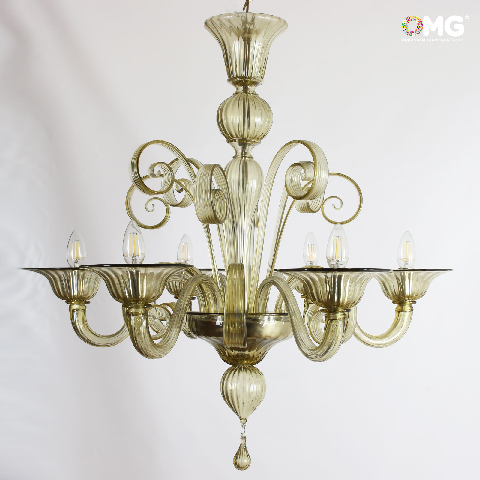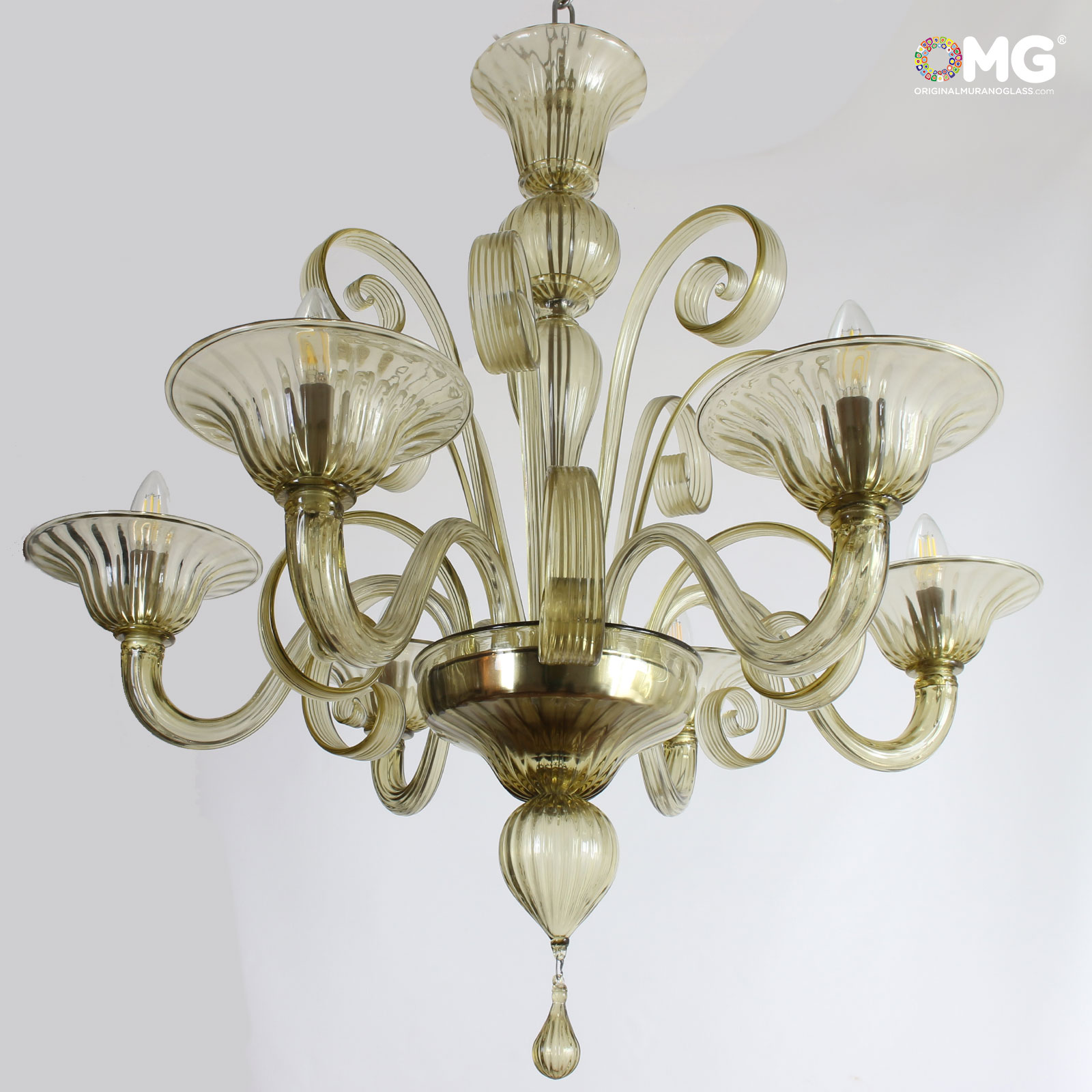 Venetian glass chandelier in light amber fume glass. Available in diffent glass colors, see pictures above.