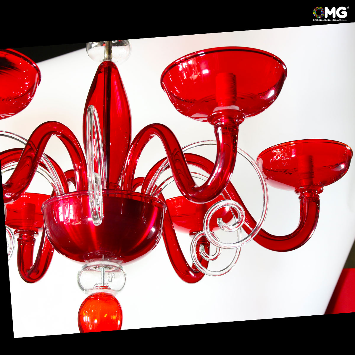 Venetian glass chandelier in red glass and crystall details. Available in diffent glass colors, see pictures above.