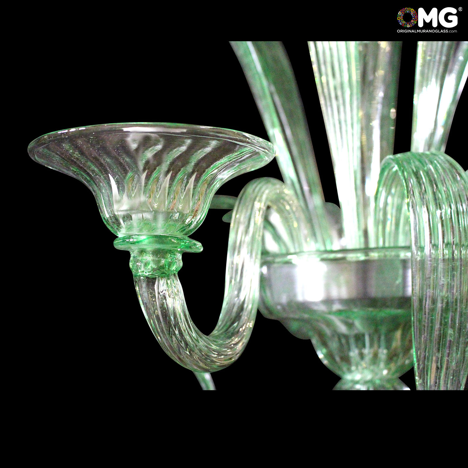 Venetian chandelier in original Murano glass artistic glass color green, ornamental elements lance.