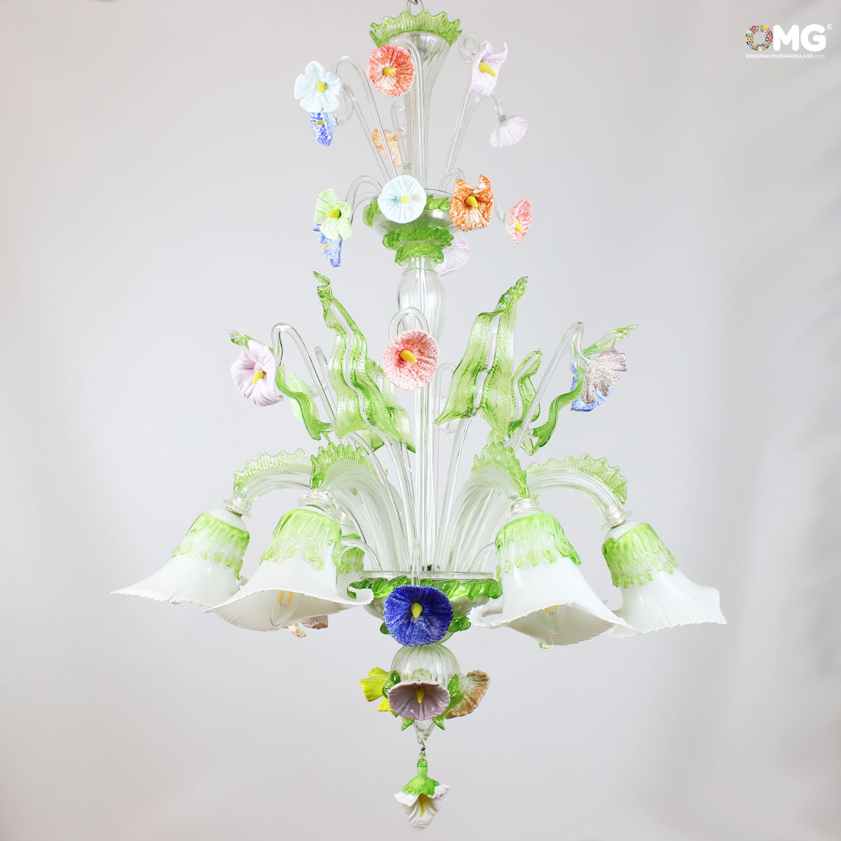 The artwork is a floral chandelier in Venetian style, this Murano chandelier enriches any interior room with elegance; Ideal for any room space, classique but also modern interior design. This venetian chandelier is an art piece itself, completely decorated and shaped by hand.