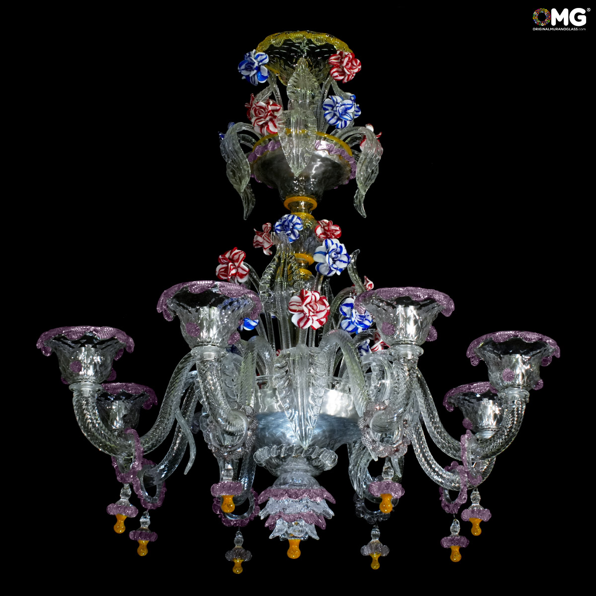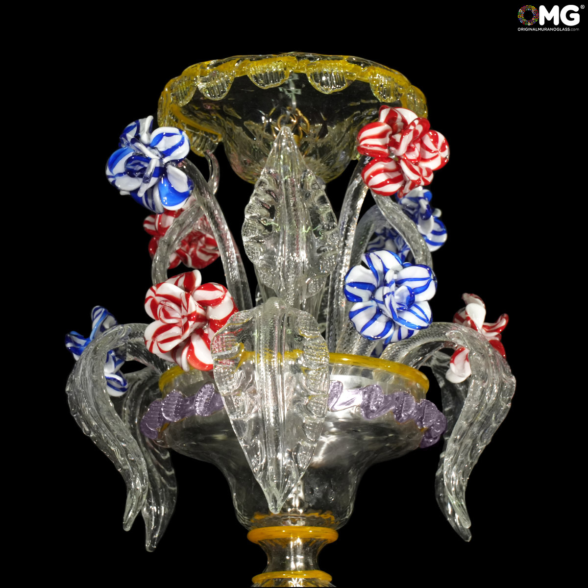 Chandelier handmade according with the old Murano glass tradition, handcrafted in blown glass.