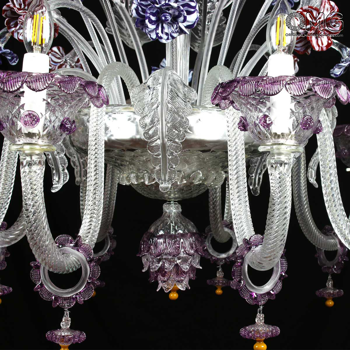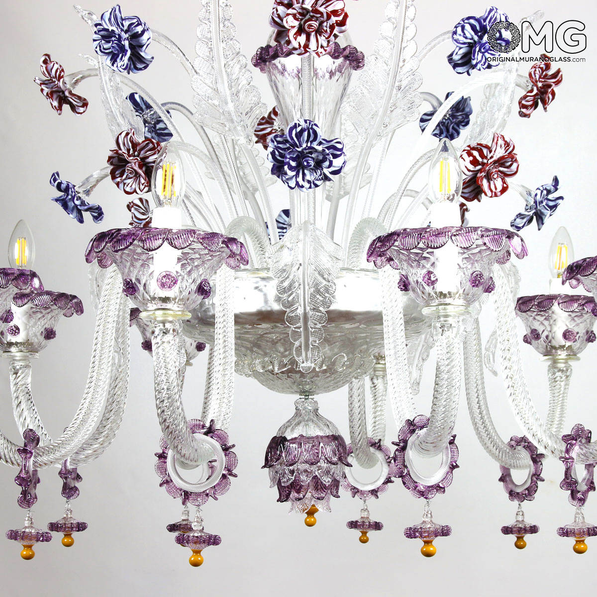Venetian Chandelier 8 lights, crystal and purple colored floral crest.