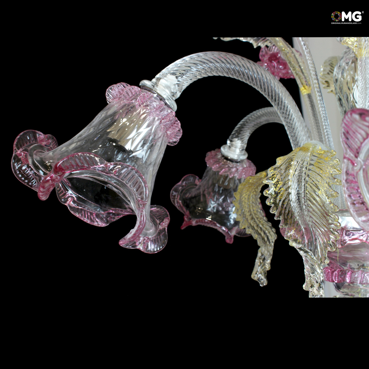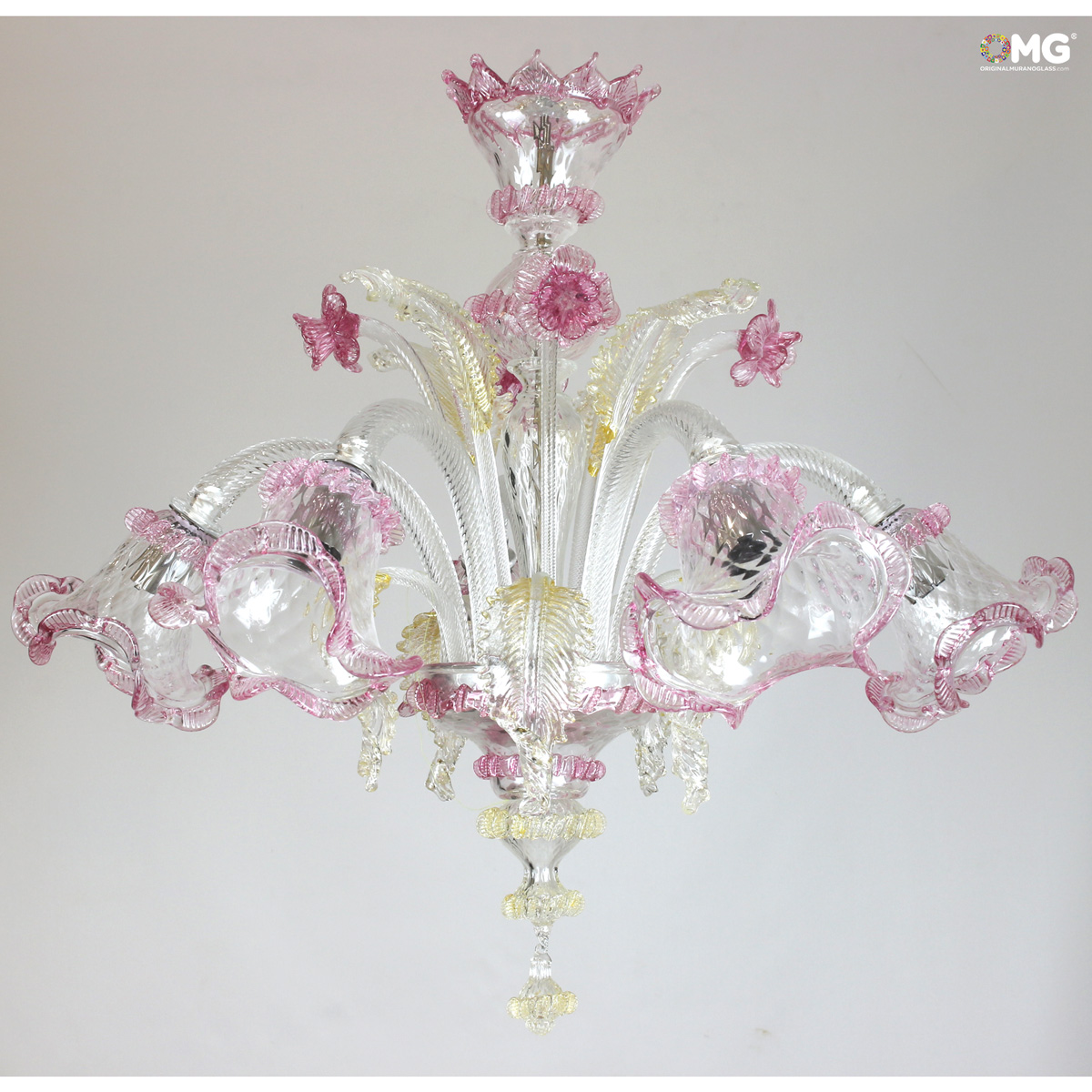 The chandelier is handmade according to the old Murano glass tradition, handcrafted in crystal glass.