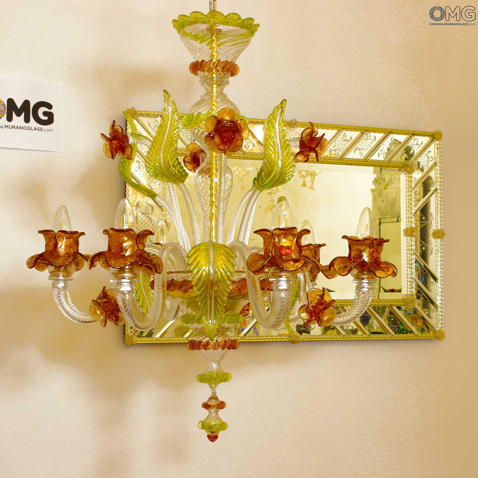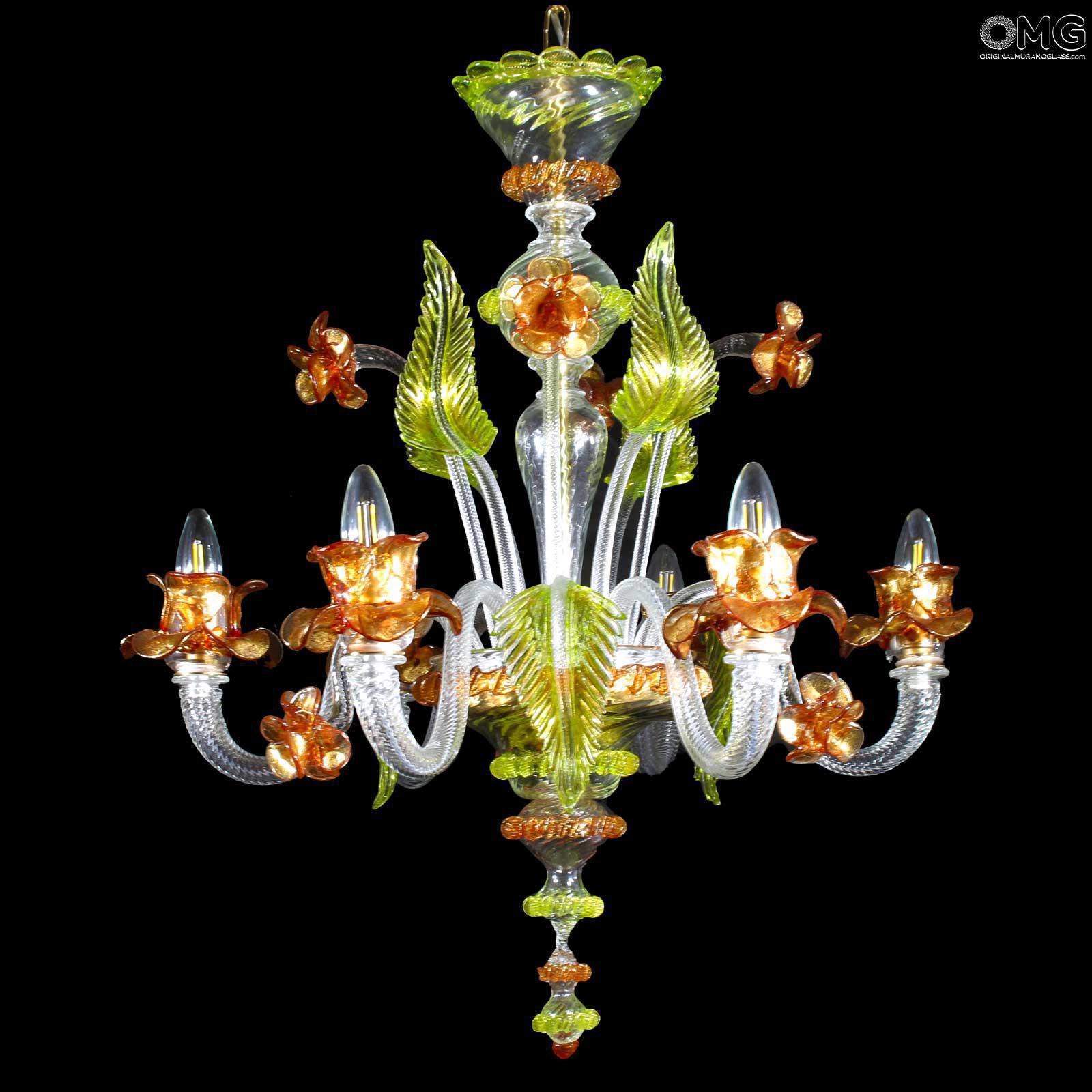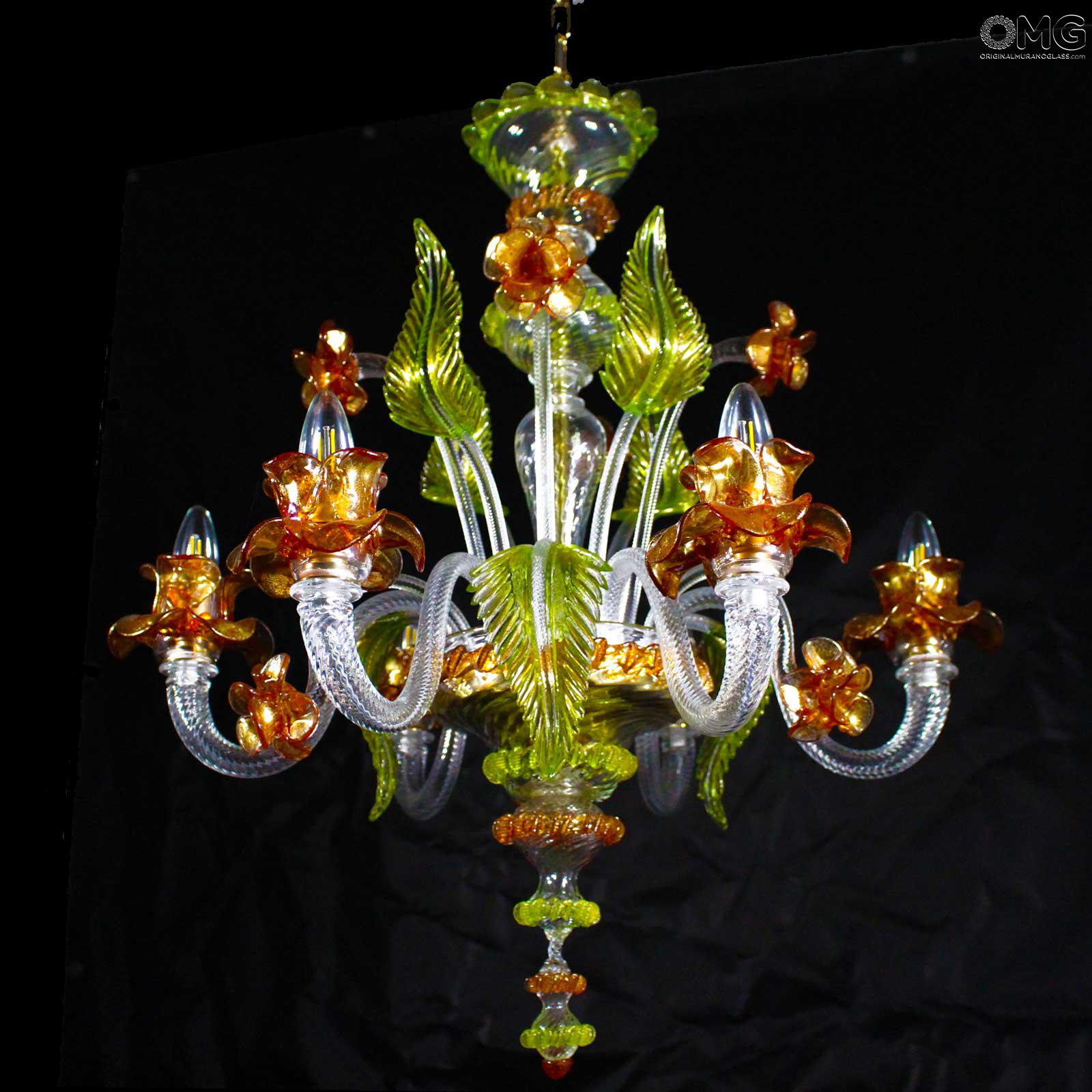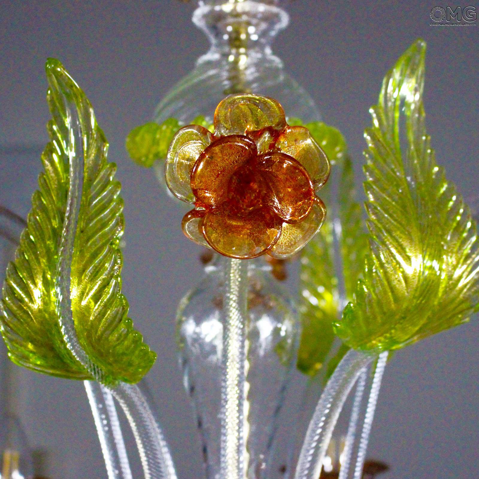 The artwork is a floral chandelier in Venetian style, this Murano chandelier enriches any interior room with elegance; Ideal for any room space, classique but also modern interior design. This venetian chandelier is an art piece itself, completely decorated and shaped by hand.