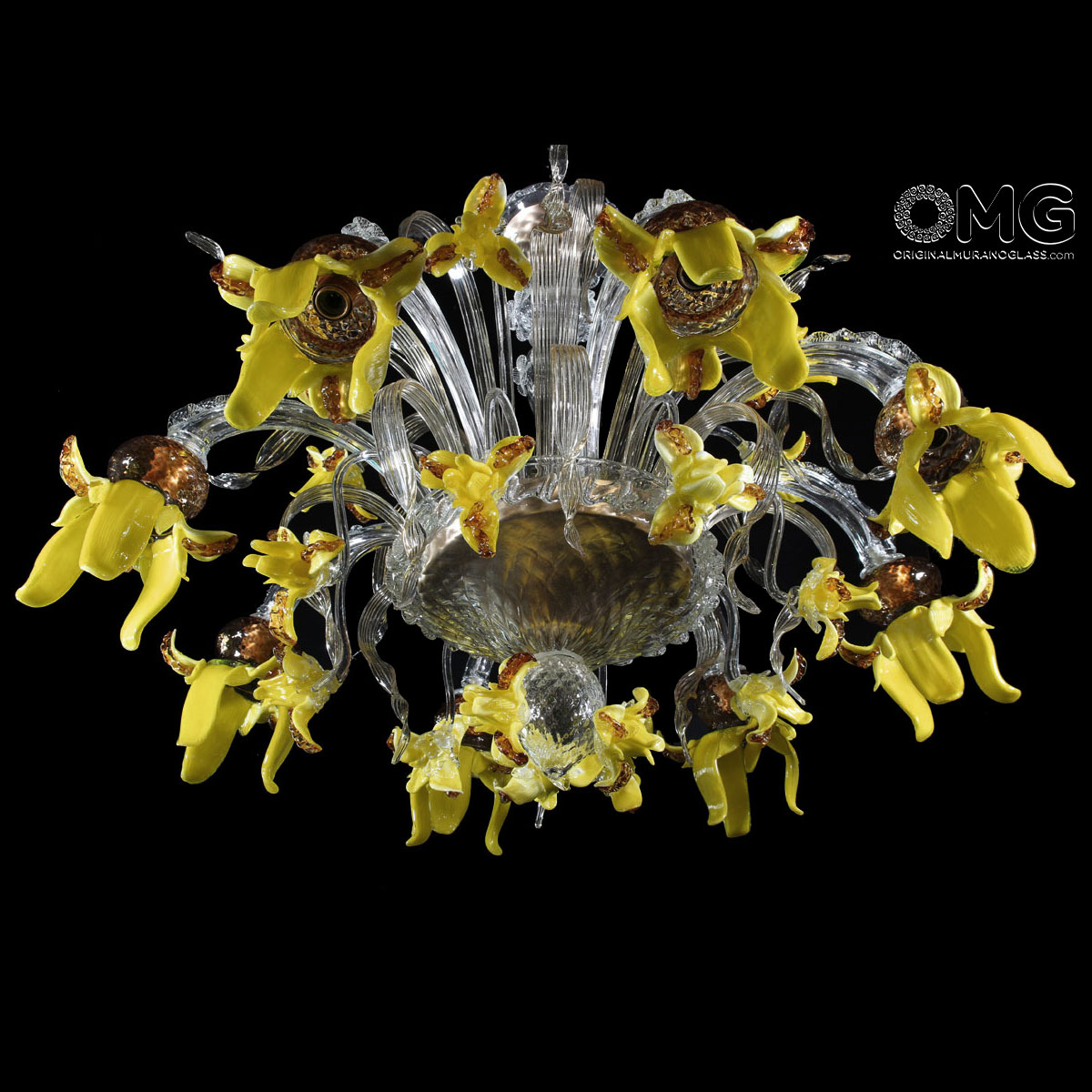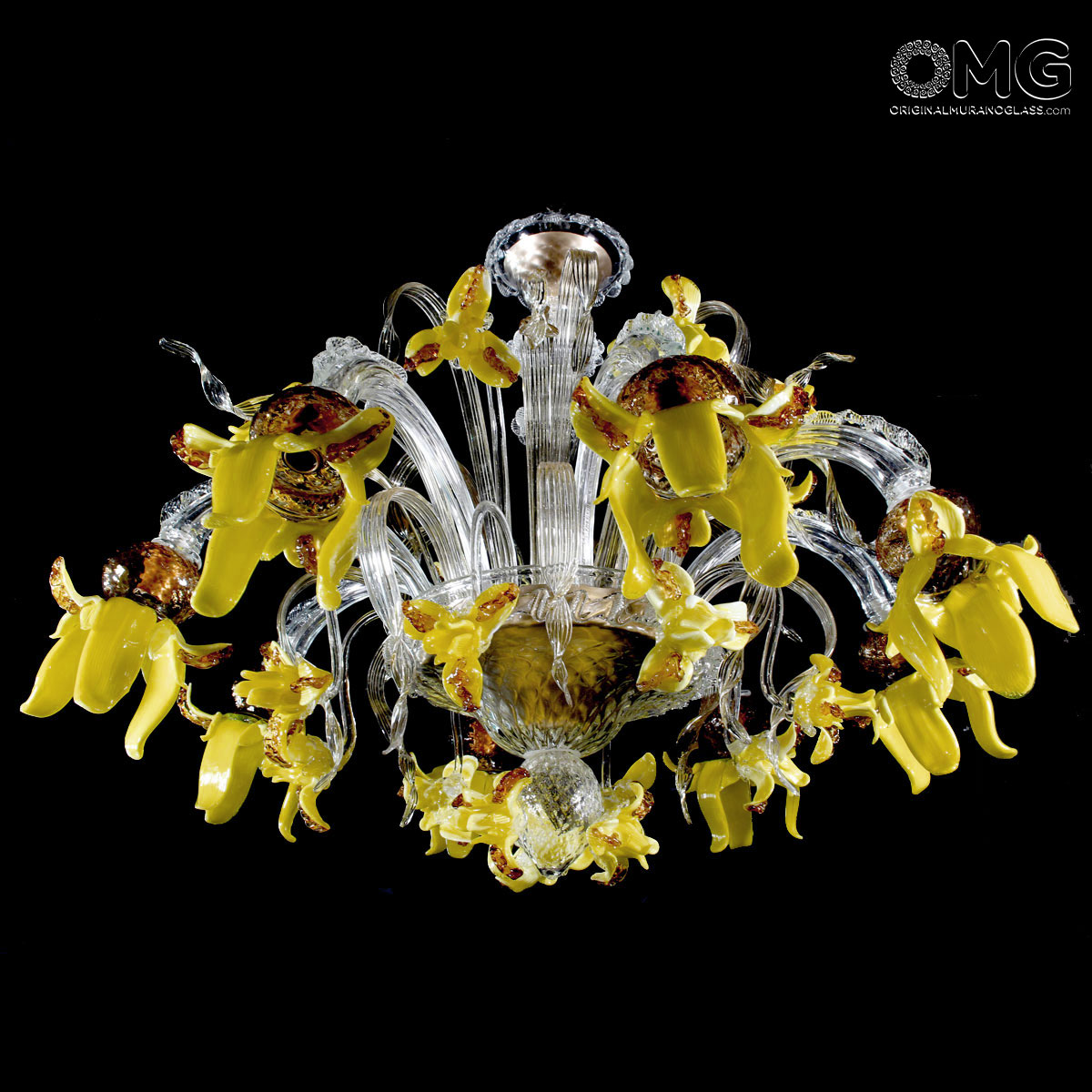8 lights chandelier handmade according with the old Murano glass tradition, handcrafted in blown glass: crystal with amber and yellow details.