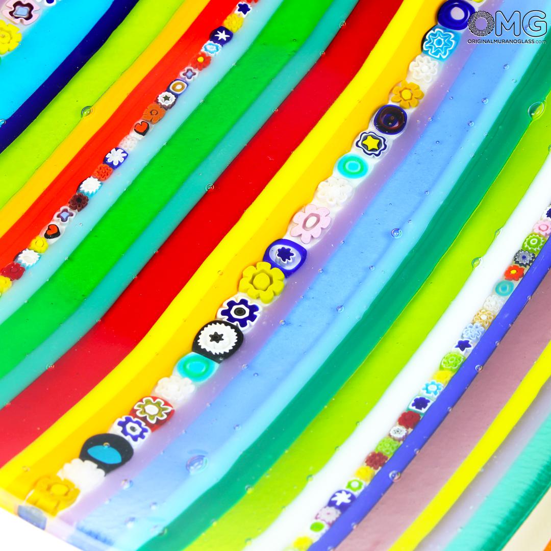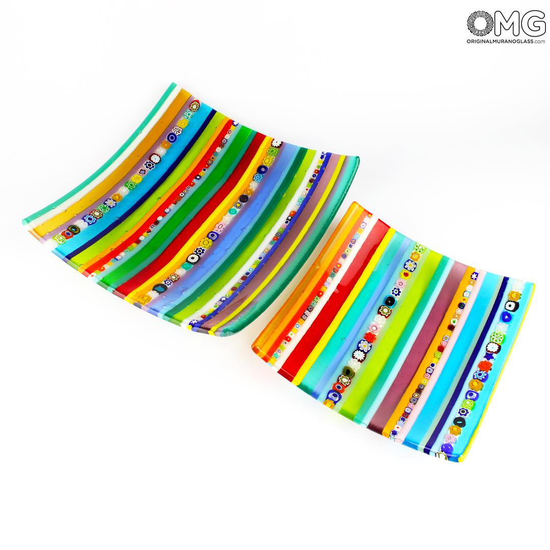 Teller, hergestellt im Glasfusing-Verfahren und mit Murrine-Millefiori-Elementen verziert. Die Teller sind in verschiedenen Größen erhältlich: Die kleinen eignen sich als kleine Mitbringsel oder als Hochzeitsgeschenk, die größeren als Tischdekoration.