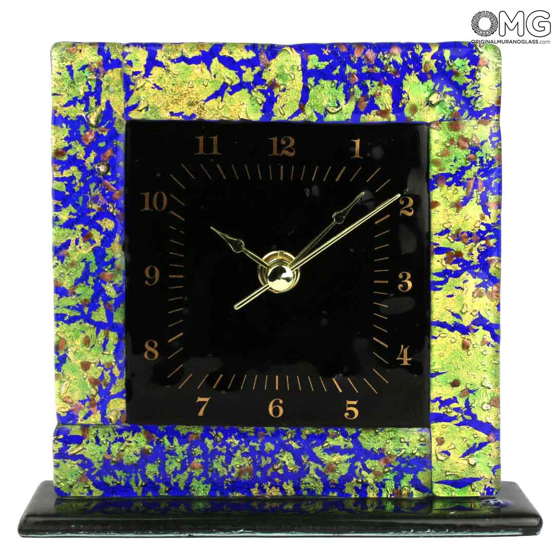 This green blue Murano glass table clock is handmade with the technique of glass fusing, enriched with pure 24 kt gold. Crafted in Murano, Venice, by skilled glass artisans, the piece features vivacious green blue tones and clean lines, making it a sophisticated décor for any desk, reception area, office or living room.
