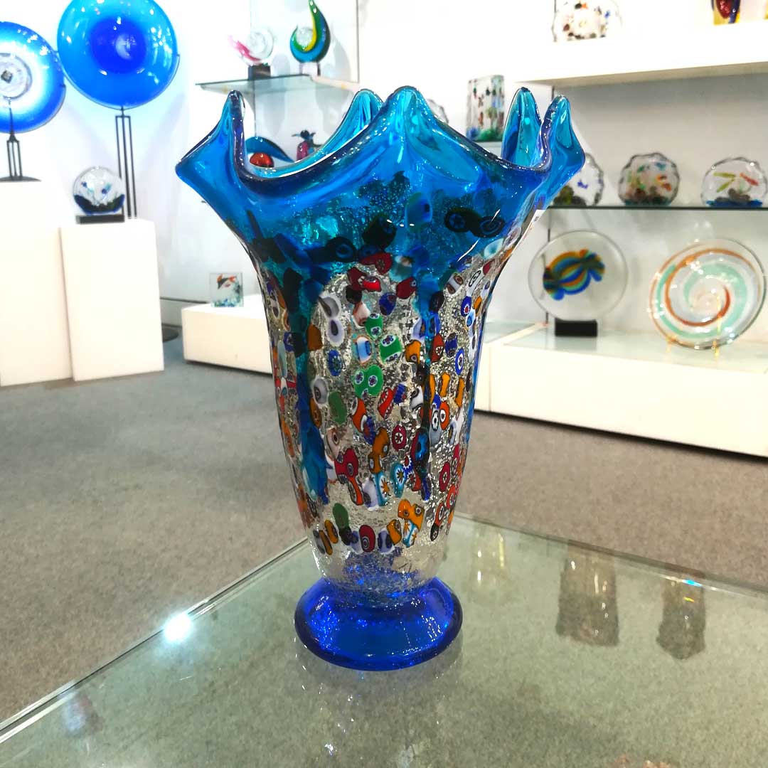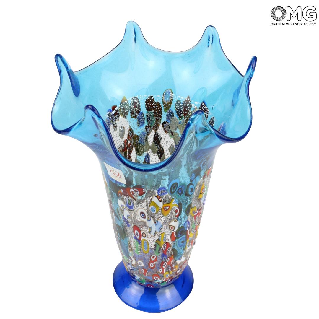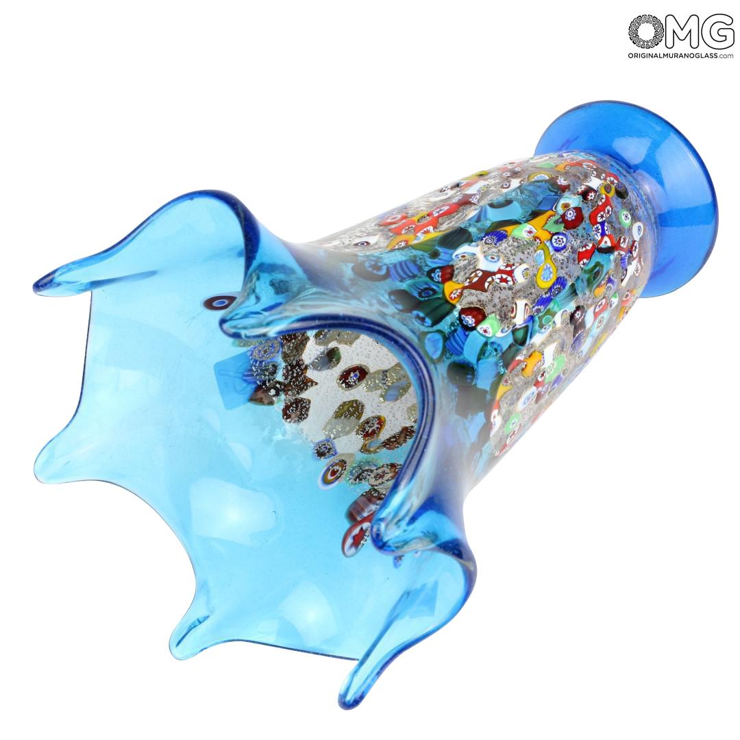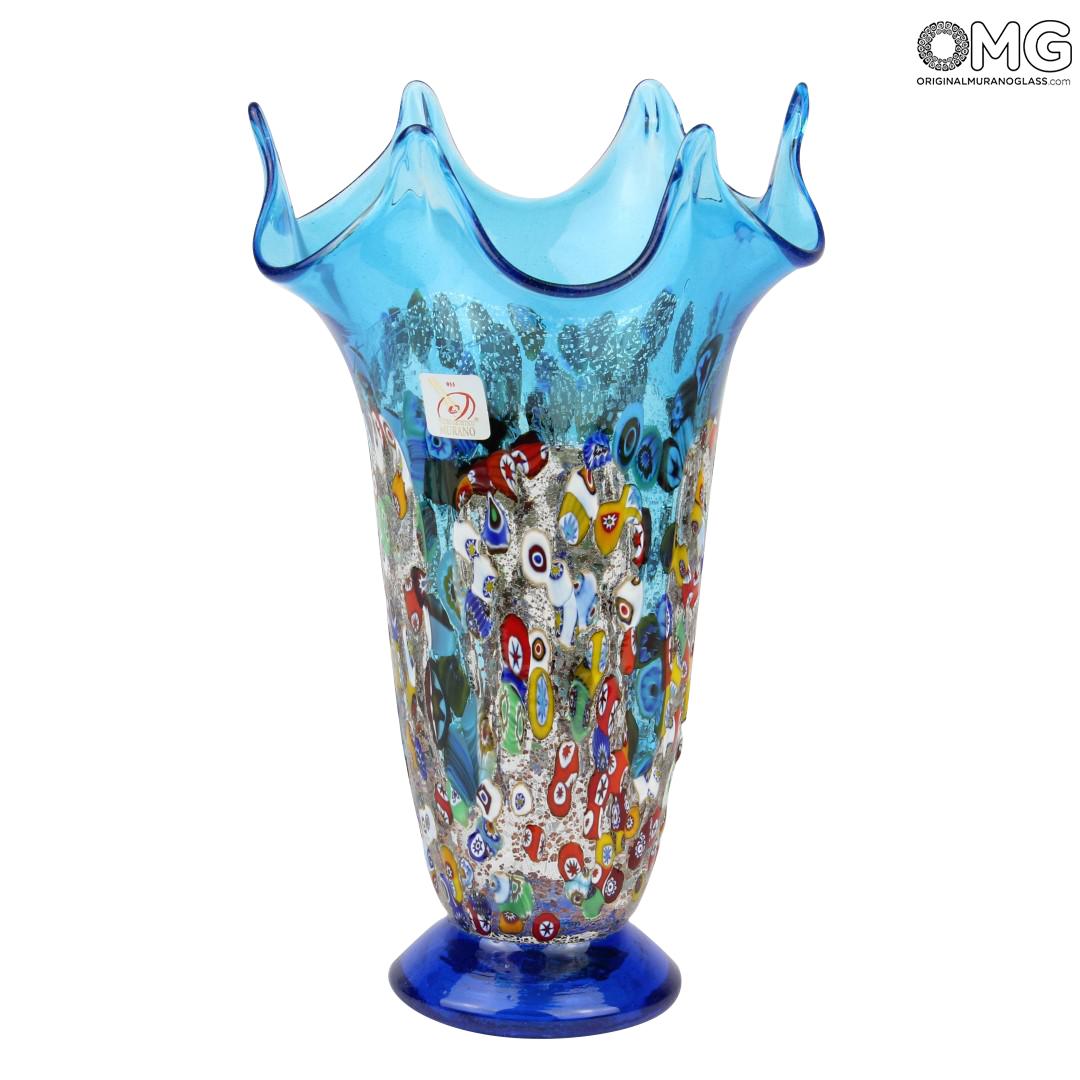 Vase handmade with the technique of glass blowing with silver and murrina milelfiori decoration. The artwork is signed by the glass master and with Original Murano Glass OMG® trademark applied.
