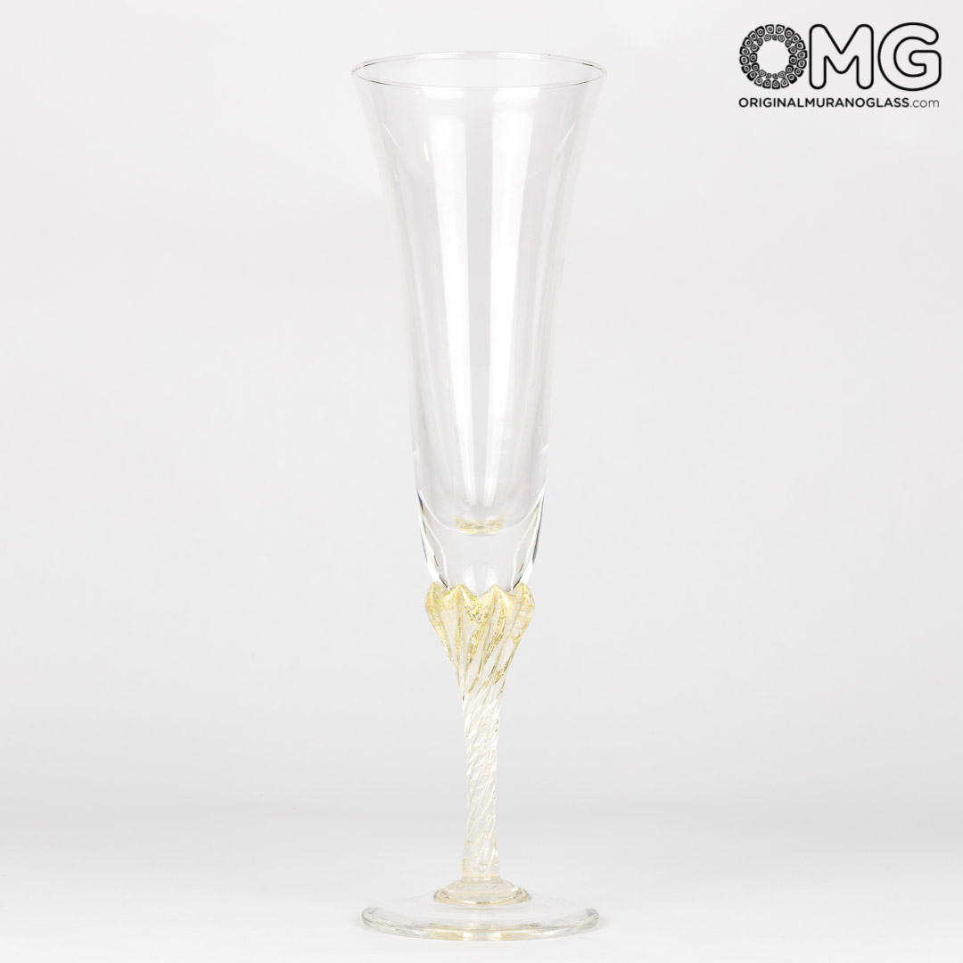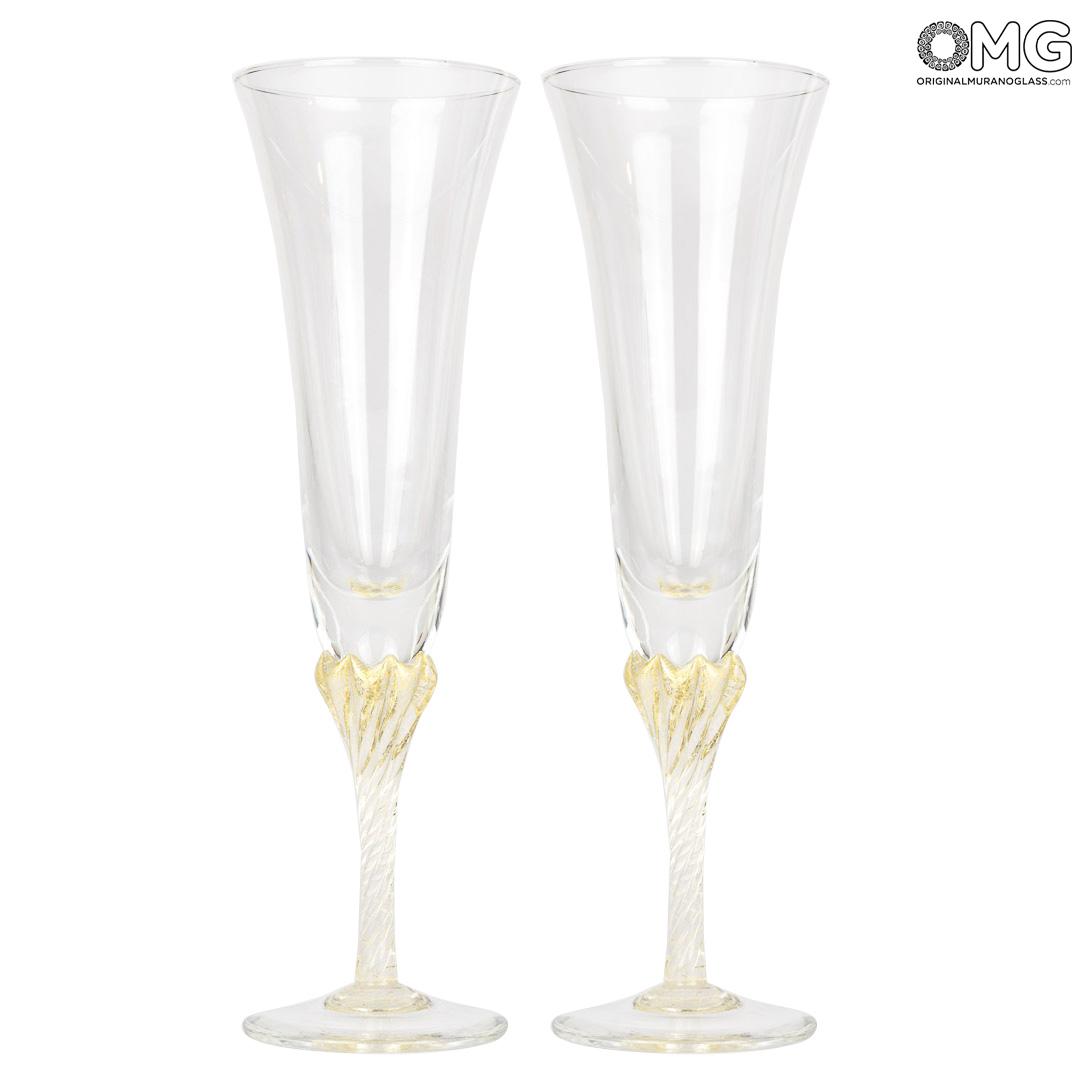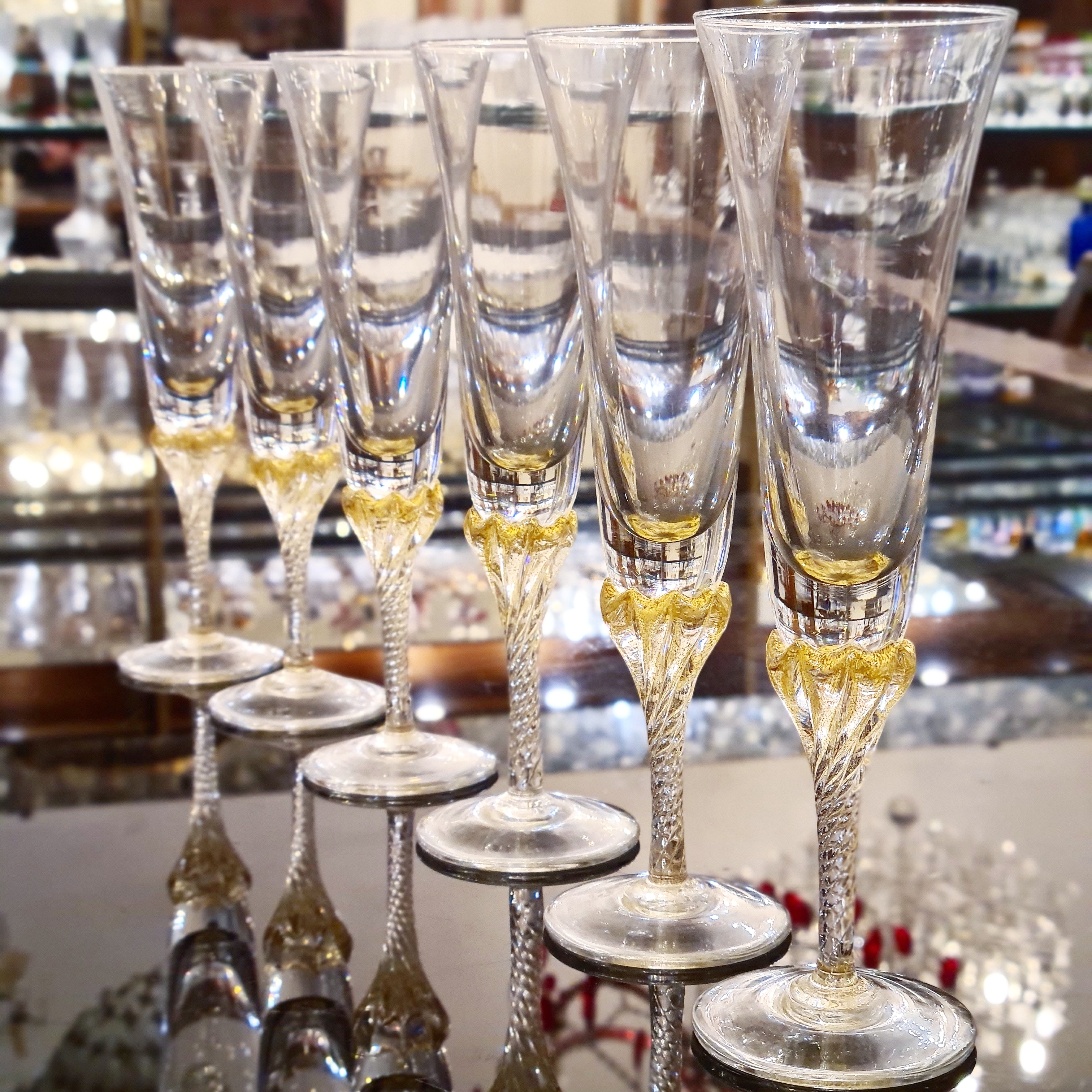 Very nice set of 2 glasses. All items are in different unique handmade with glass and gold leaft 24kt. Made by blown glass technique. Elegant and preciose artworks pieces. Not stamp, but each Champagne Flute of this collection is an unique piece handmade.