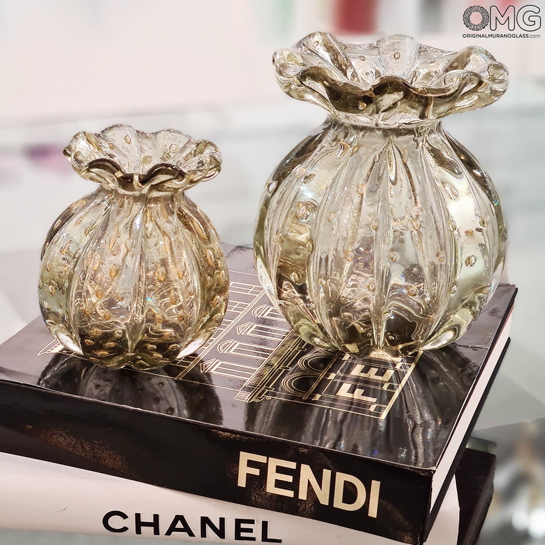 Luxury hand made vase inspired by the 60s. featuring bubbles details on grey glass. Imagine this eye-catching artwork as a precious centerpiece for your living room