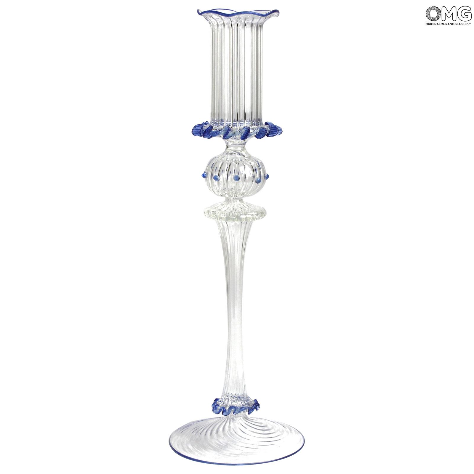 Feel the romance of Venice without leaving your home when you light up candles on these elegant and artistic handcrafted Murano Glass candle holders. A fine example of famous Murano Glass artistic tradition, this Venetian candlestick made entirely by hand combines uniquely translucent glass of exceptional quality with beautiful lace-like blue glass accents .