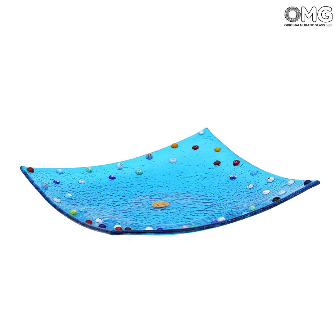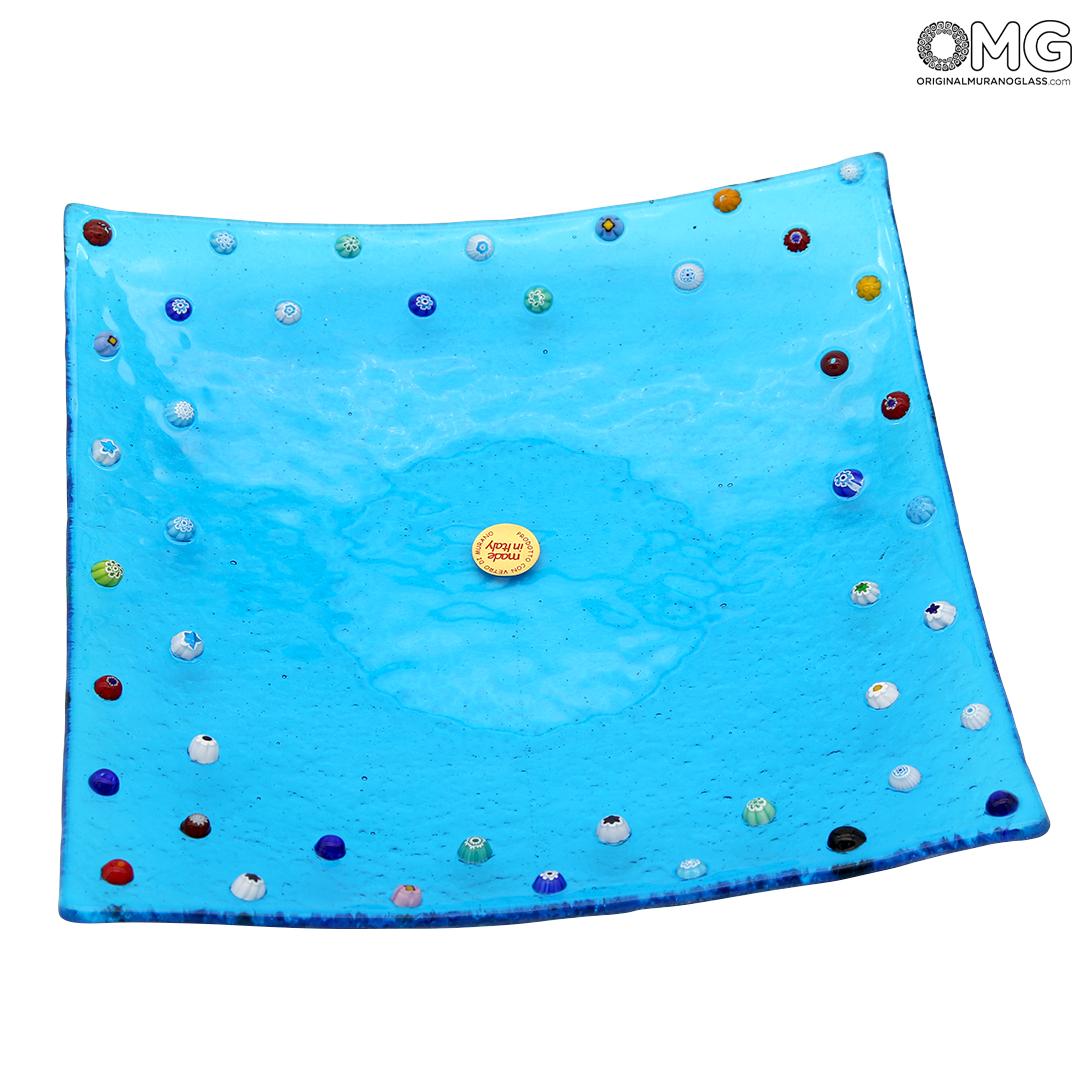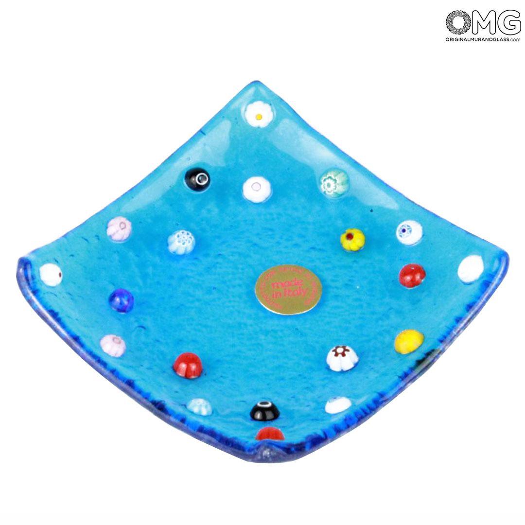 Murano-Millefiori-Verzierung auf hellblauem Glas, mit reizvollem Kontrasteffekt. Hergestellt in der Glasfusing-Technik. Kann als Aschenbecher oder zur Aufbewahrung von Kleingeld verwendet werden.