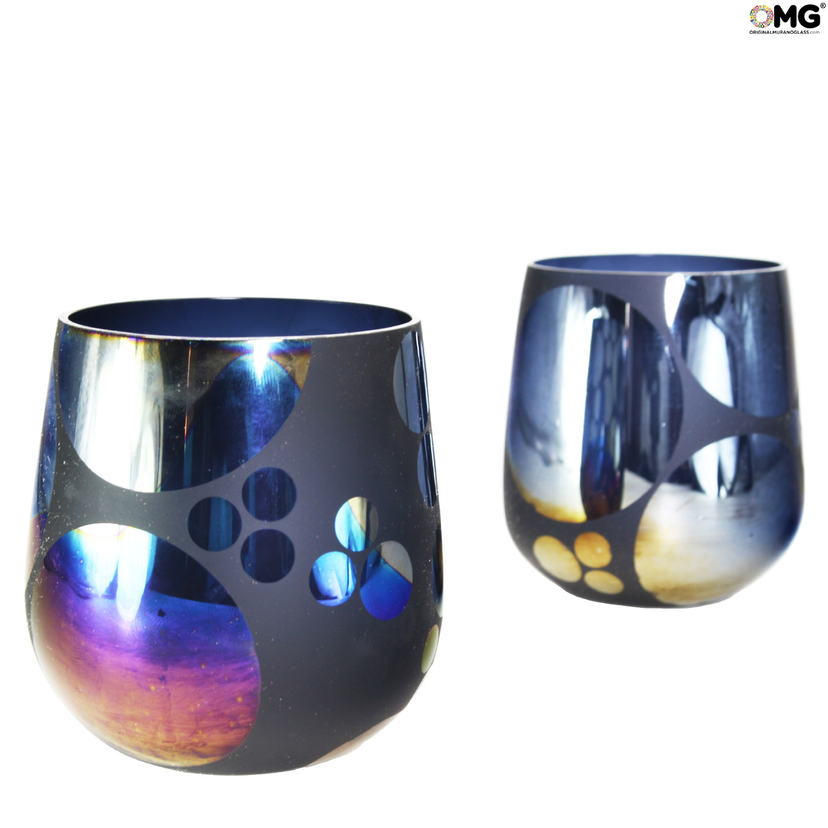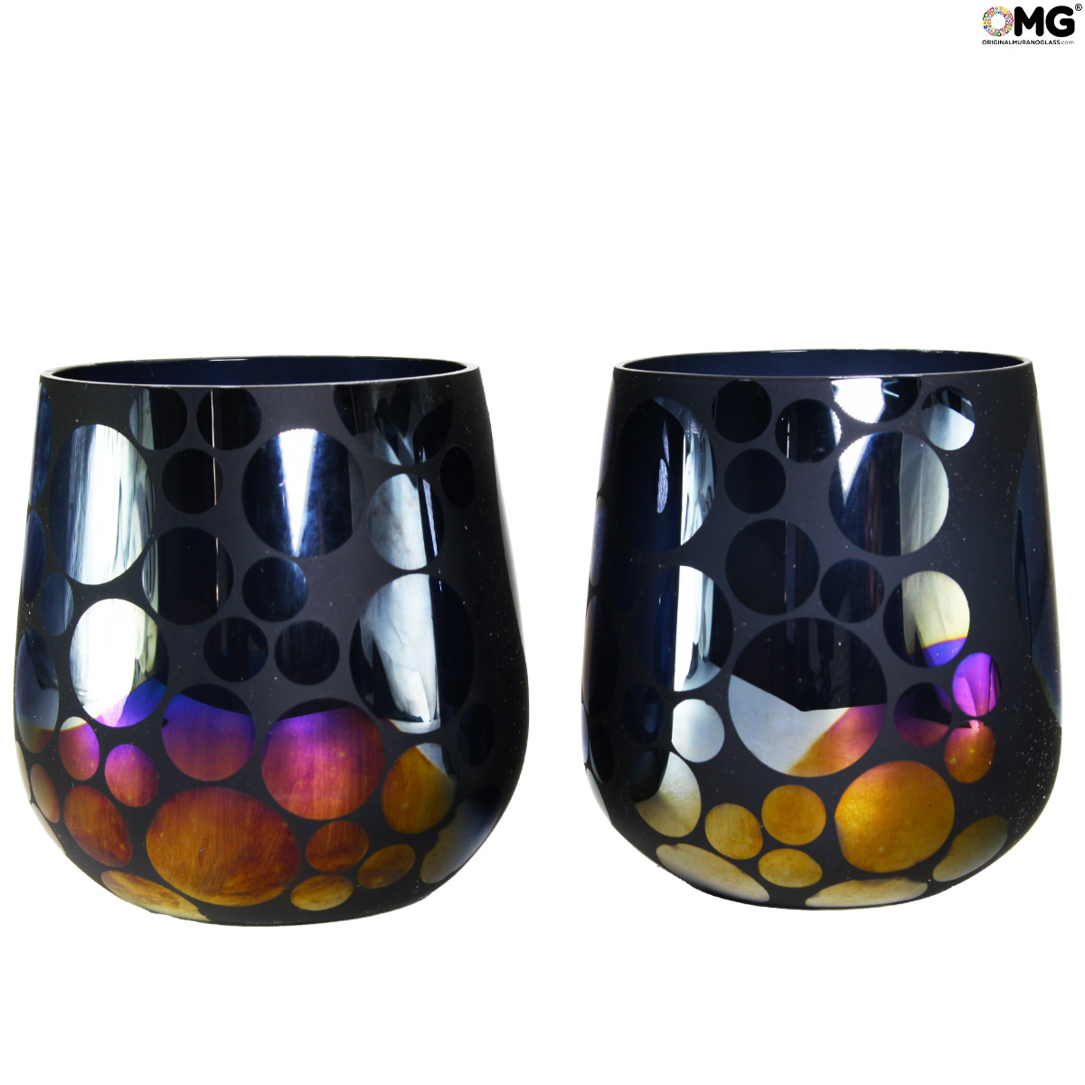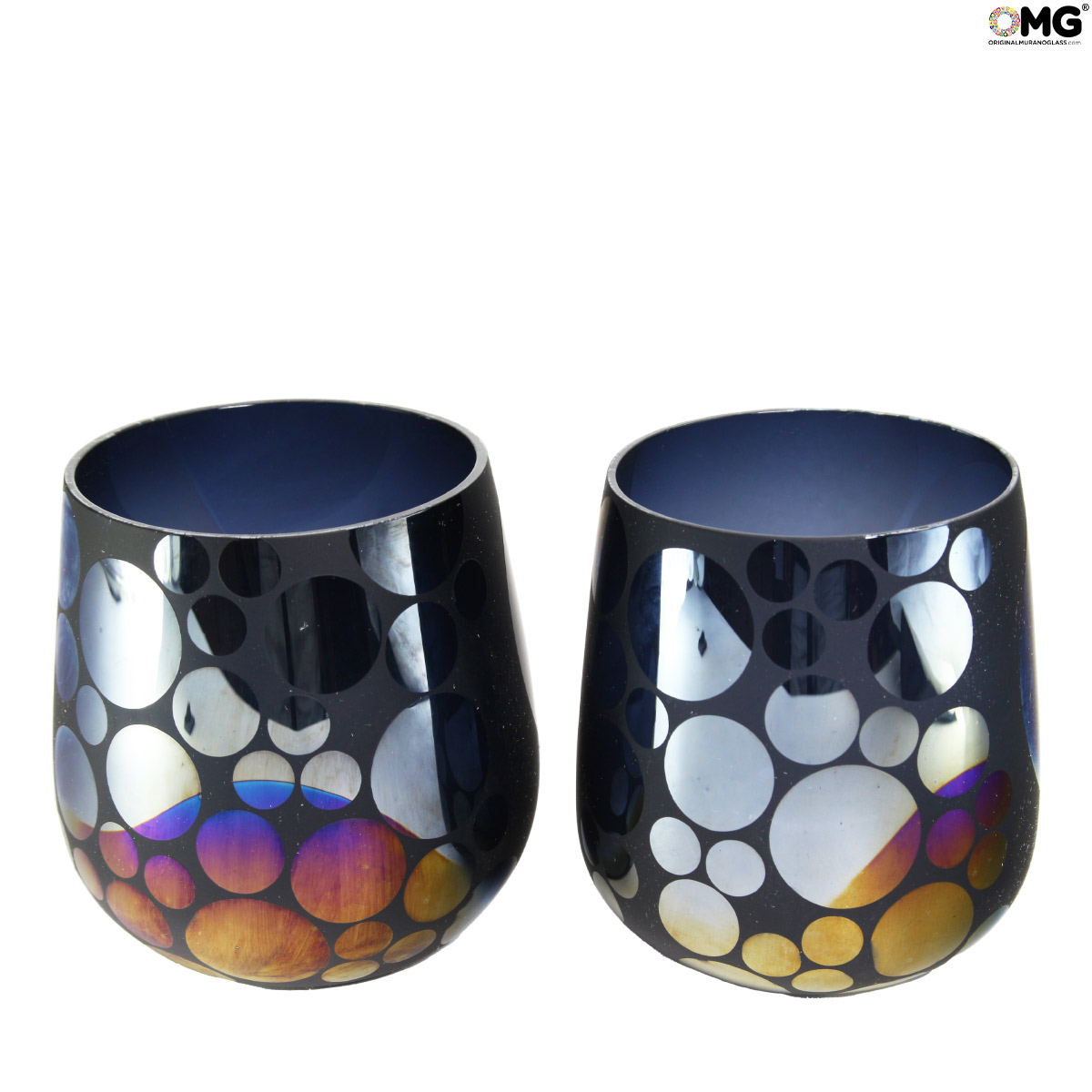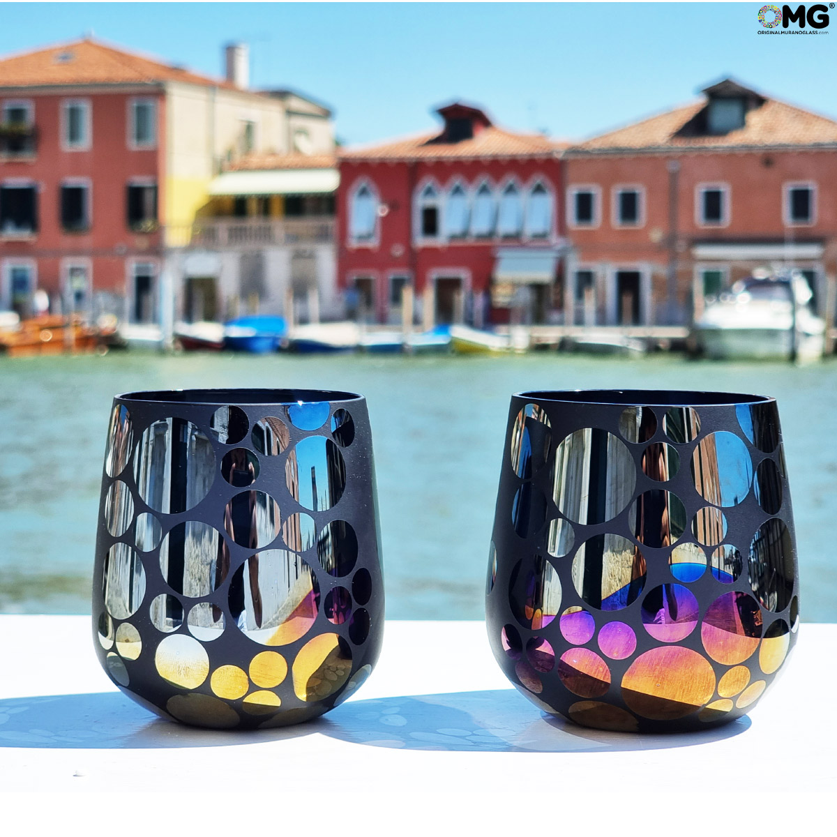 Cool set of 2 mirrored glasses made with the technique of glass blowing, little pieces of glass used to give colors.