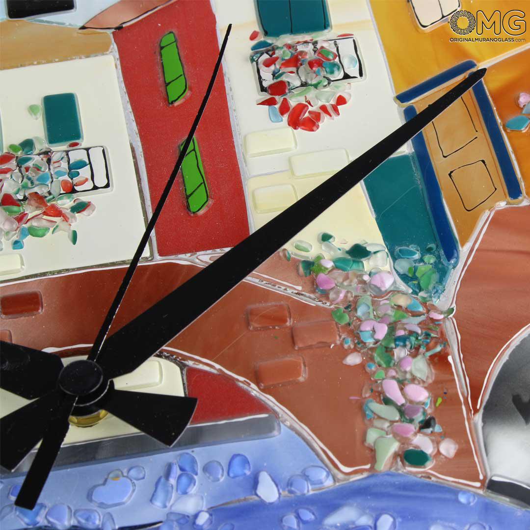 Wall clock made with the technique of fusing glass, assembling all single pieces.