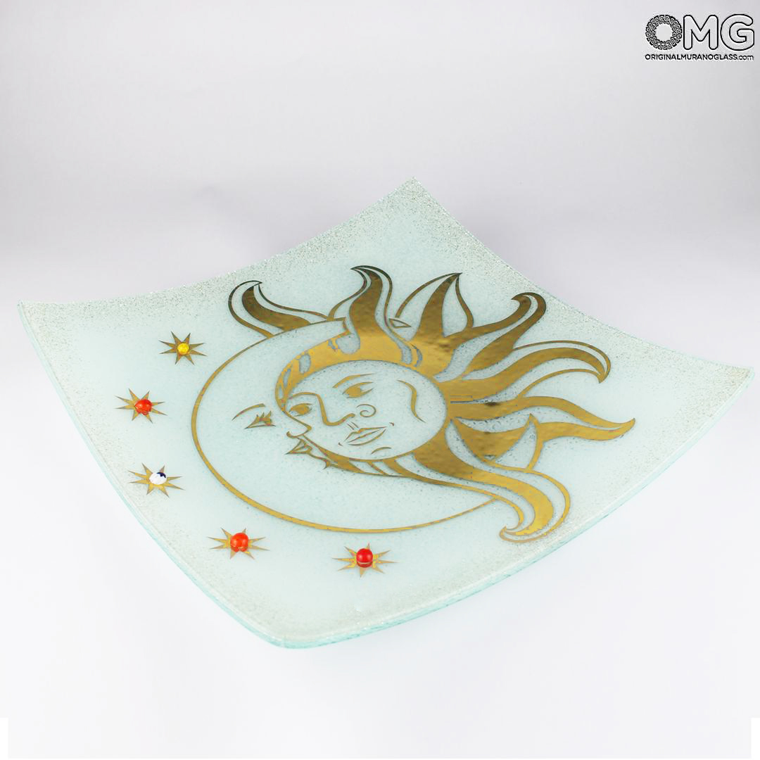 Die berühmte und farbenfrohe „Sun and Moon“-Platte, hergestellt in der Glasfusing-Technik unter Verwendung von Murano-Murrine-Millefiori und Blattgold. Ein praktisches Wandbild, das sich perfekt zur Dekoration jedes Regals oder Tisches eignet.