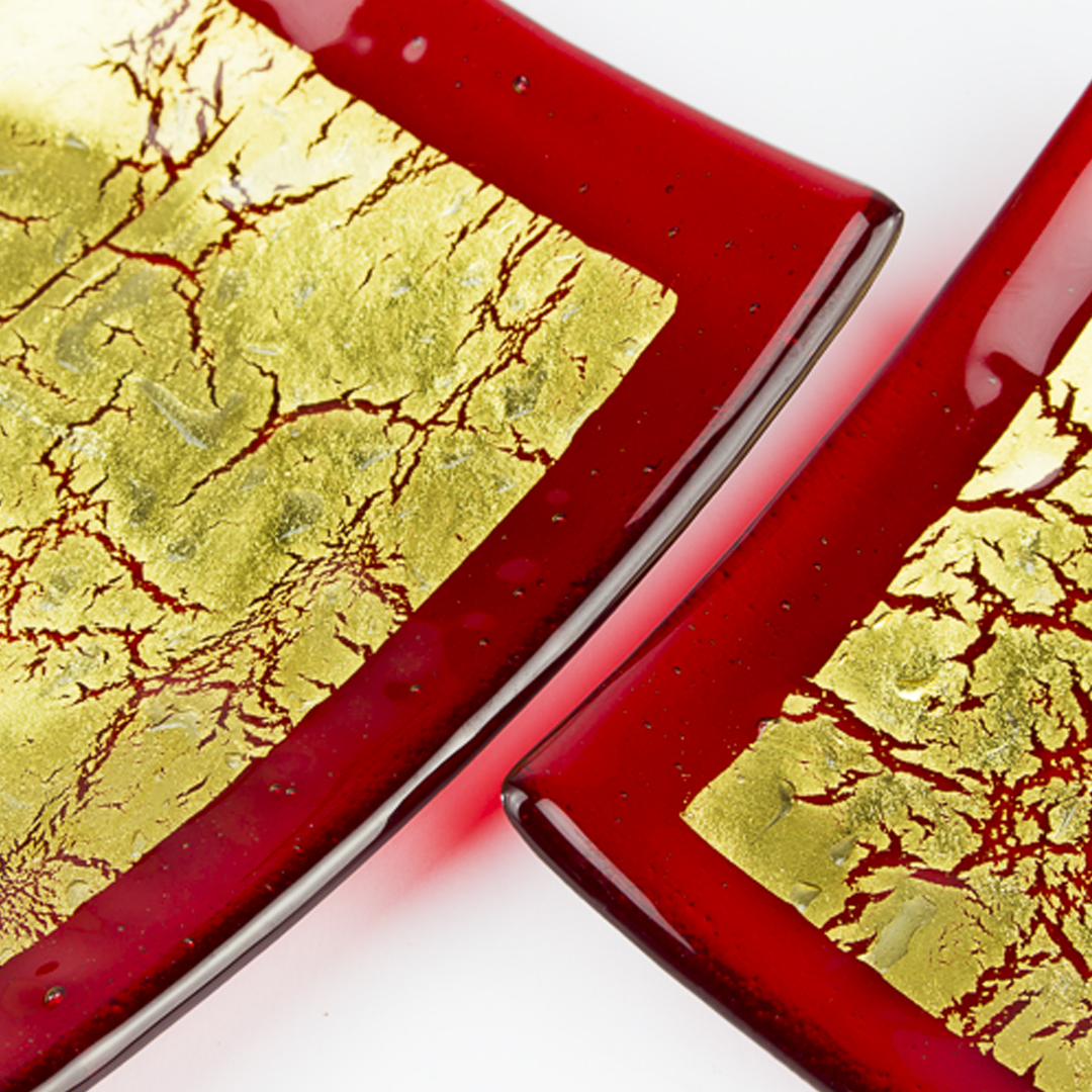 Teller, hergestellt im Glasfusing-Verfahren und mit edlem 24-karätigem Blattgold verziert. Die Teller sind in verschiedenen Größen erhältlich; die kleinen eignen sich als kleine Schalen, die größeren als Tischdekoration.