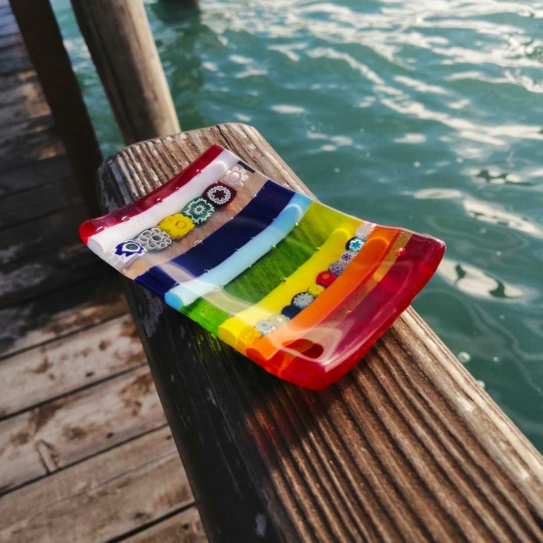 Teller, hergestellt im Glasfusing-Verfahren und mit Millefiori-Murrine verziert. Die Teller sind in verschiedenen Größen erhältlich; die kleinen eignen sich als kleine Geschenktütchen oder als Hochzeitsgeschenk, die größeren als Tischdekoration.