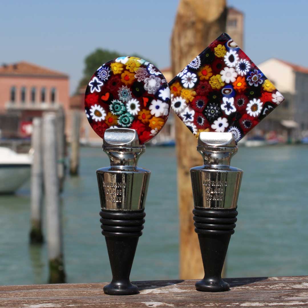 Handgefertigter Flaschenverschluss aus Original-Murano-Glas, hergestellt im Fusing-Verfahren, mit einer Mischung aus Millefiori-Farben.
