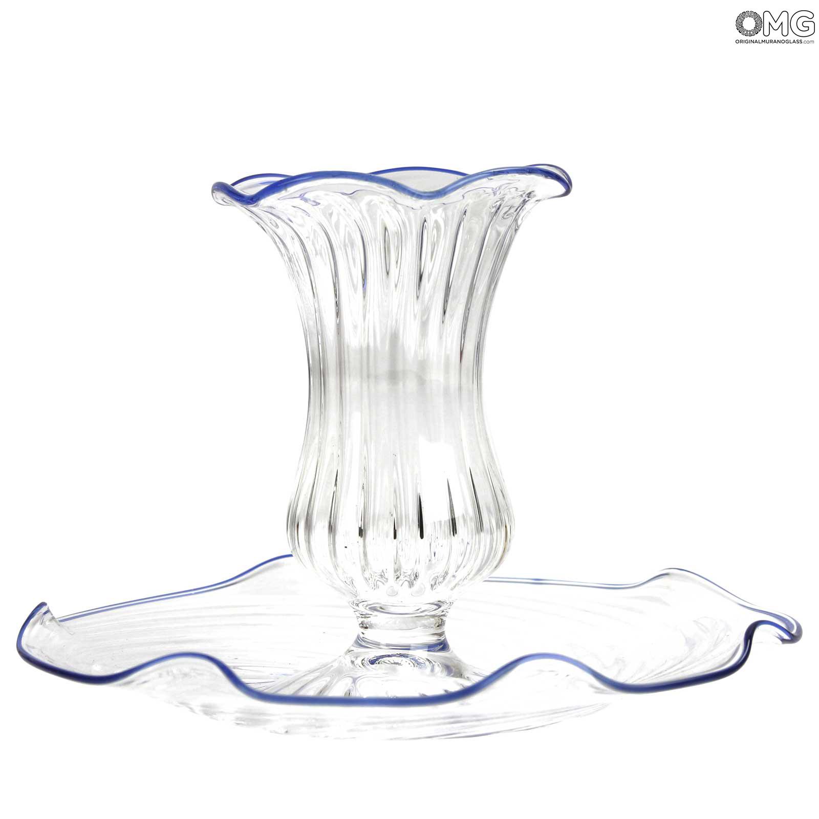 Un bell'esempio della famosa tradizione artistica del vetro di Murano, questo candelabro veneziano realizzato interamente a mano combina un vetro traslucido di eccezionale qualità con splendidi accenti di vetro blu simili a pizzo.