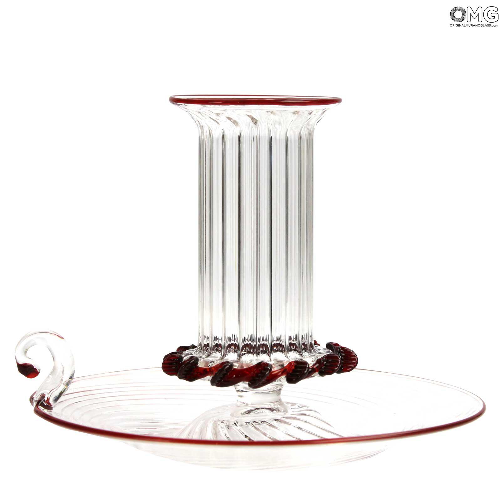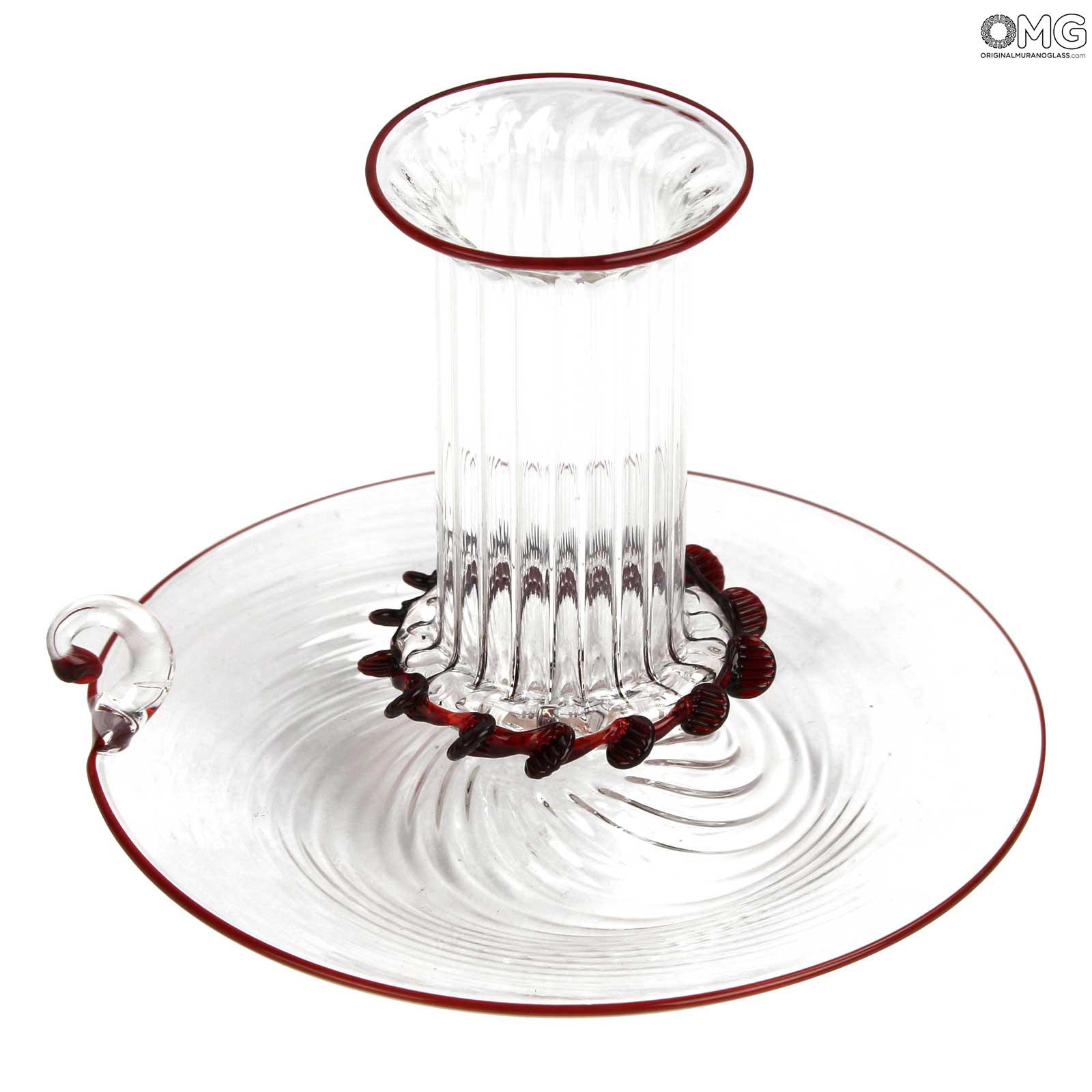 Il vetro è trasparente, orlato di rosso, la bravura del maestro sta nel creare un effetto di movimento nel vetro. La parte piu' bassa sembra giri su se stessa, quasi mossa dal vento.