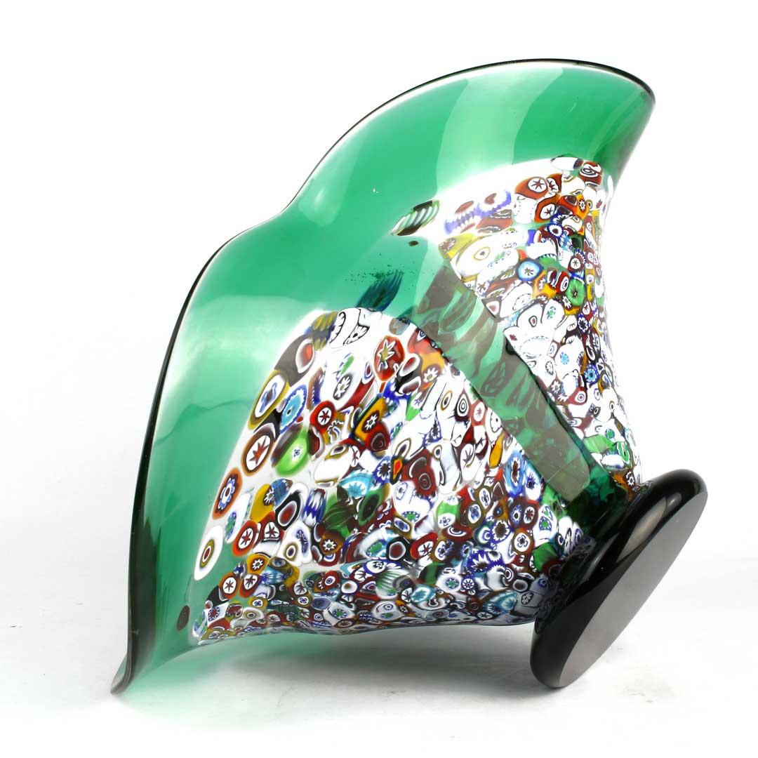 Piatto in vetro soffiato decorato con murrine millefiori e vetro di Murano. Particolare la forma ondulate del bordi. Con il marchio Vetro Artistico® Murano applicato.