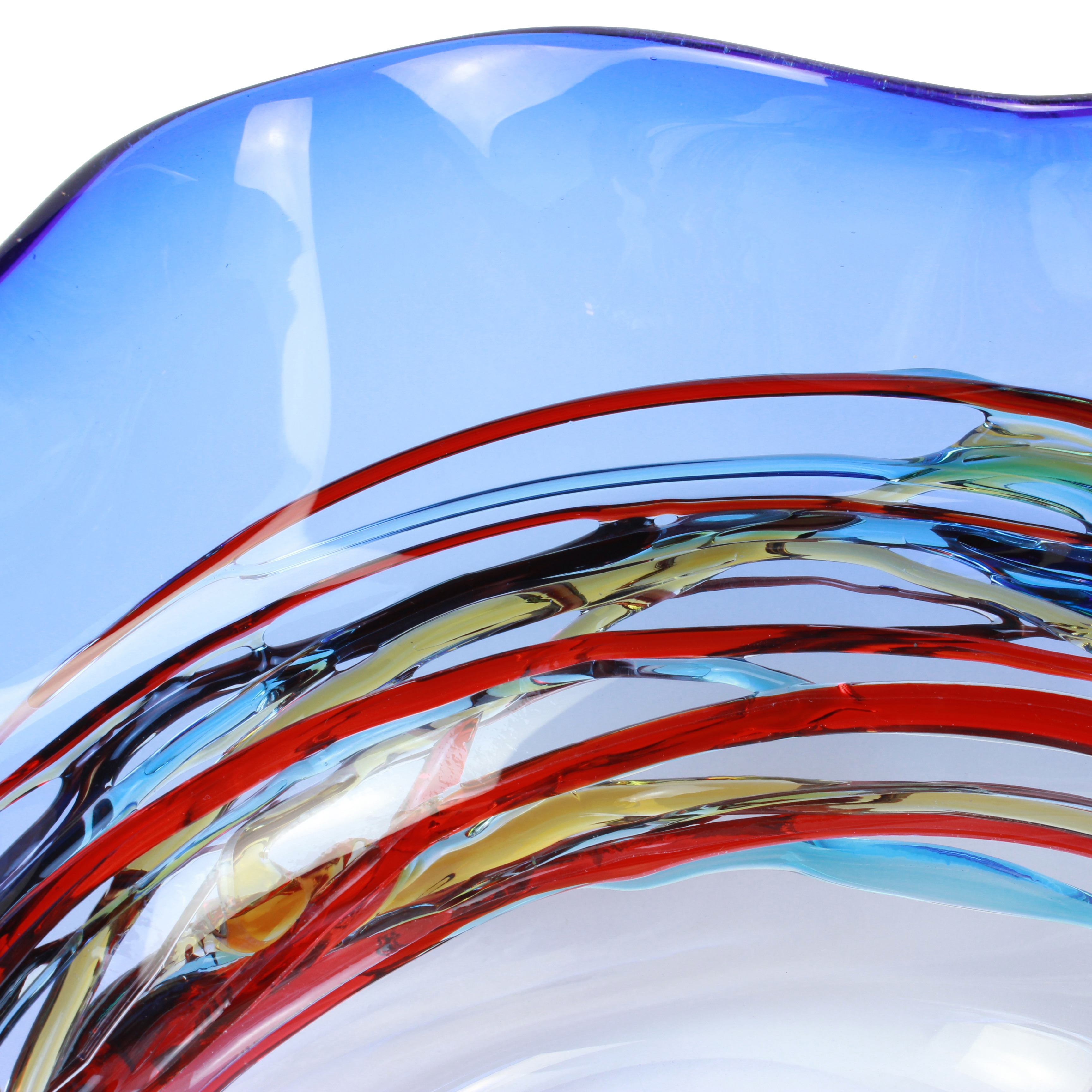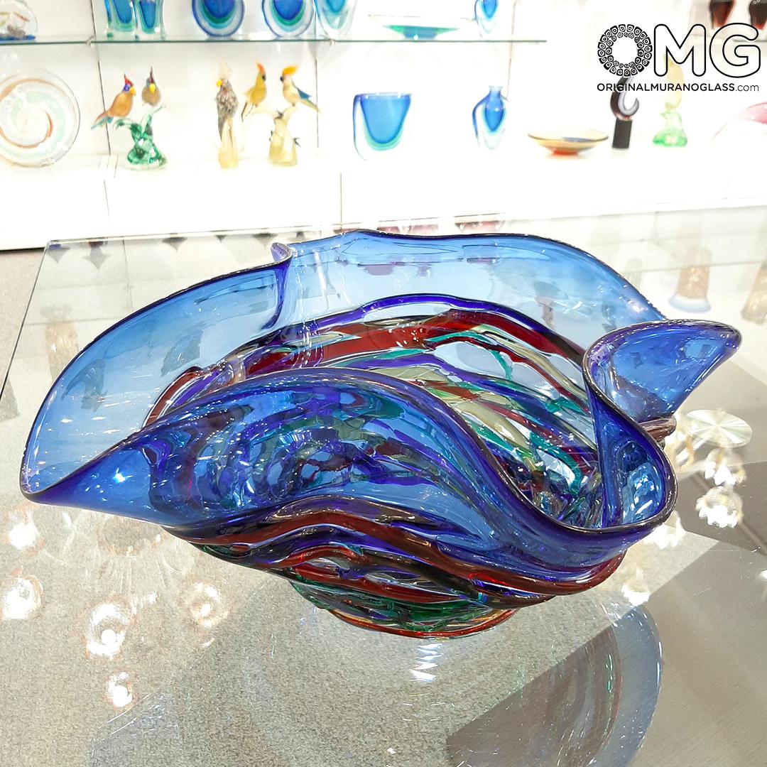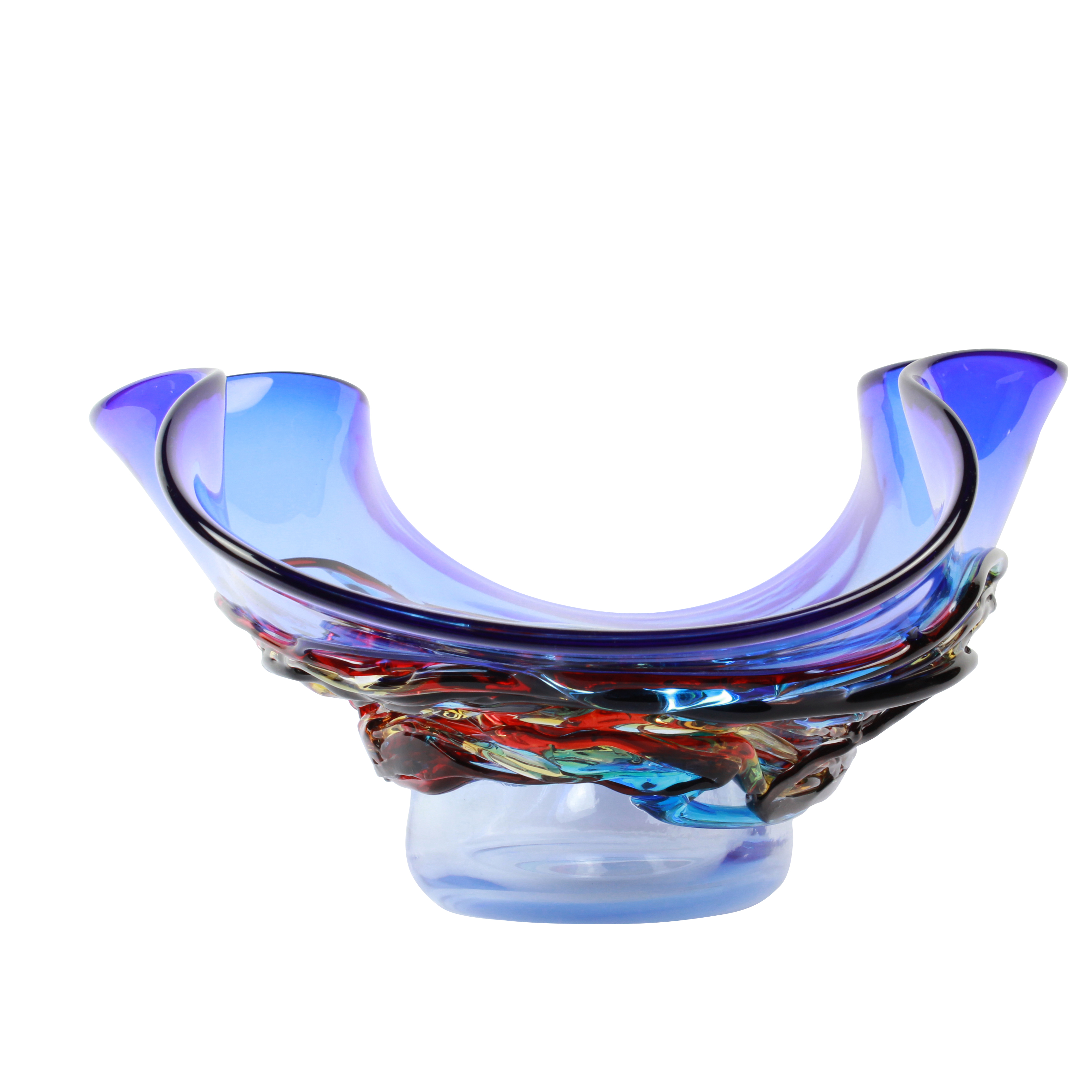 Bellissimo vaso/piatto centrotavola in vetro soffiato con decoro di vetro colato sulla superficie, oggetto molto elegante e di particolare effetto. Lavorato a puntello molato e lucidato a mano. Firmato dal maestro con incisione a freddo