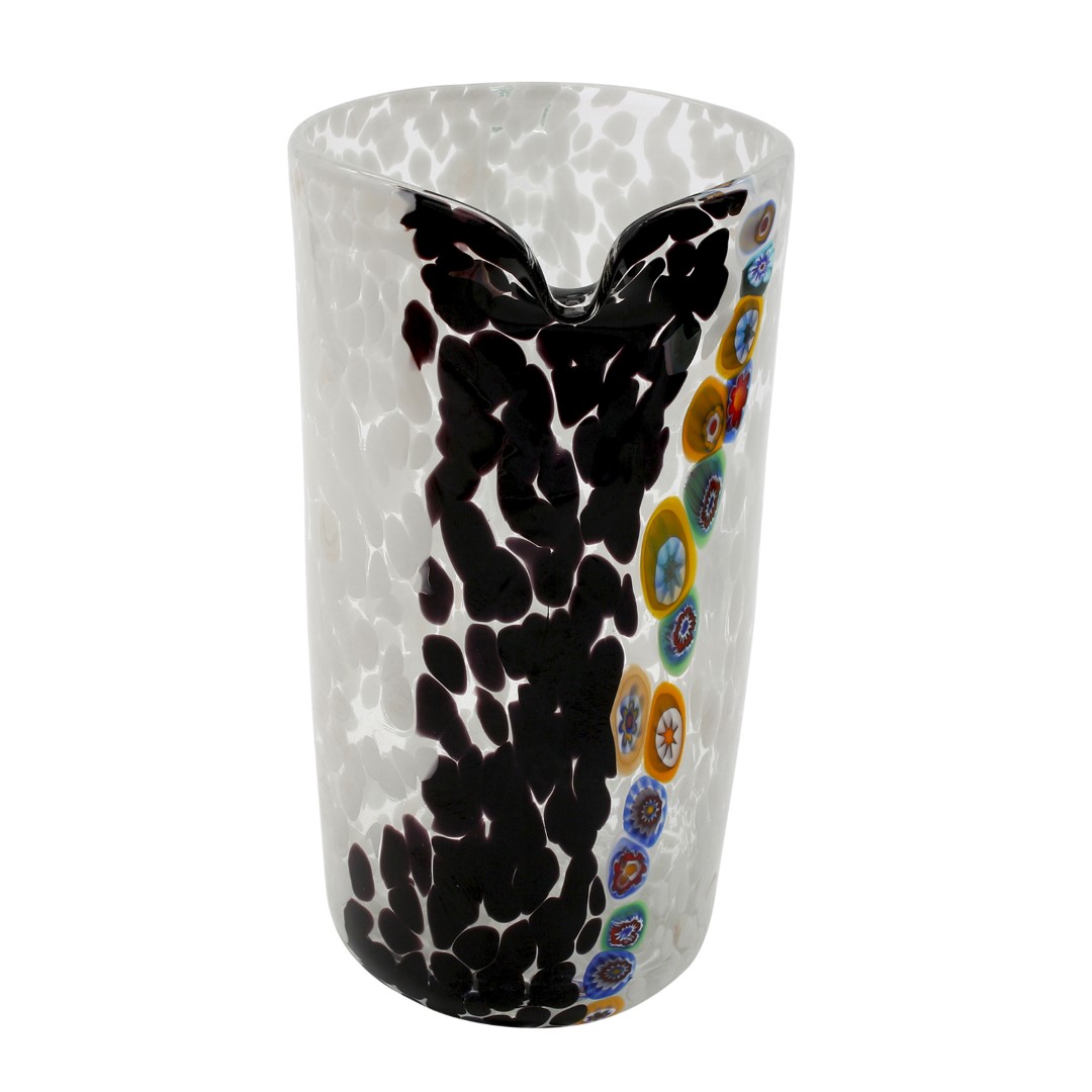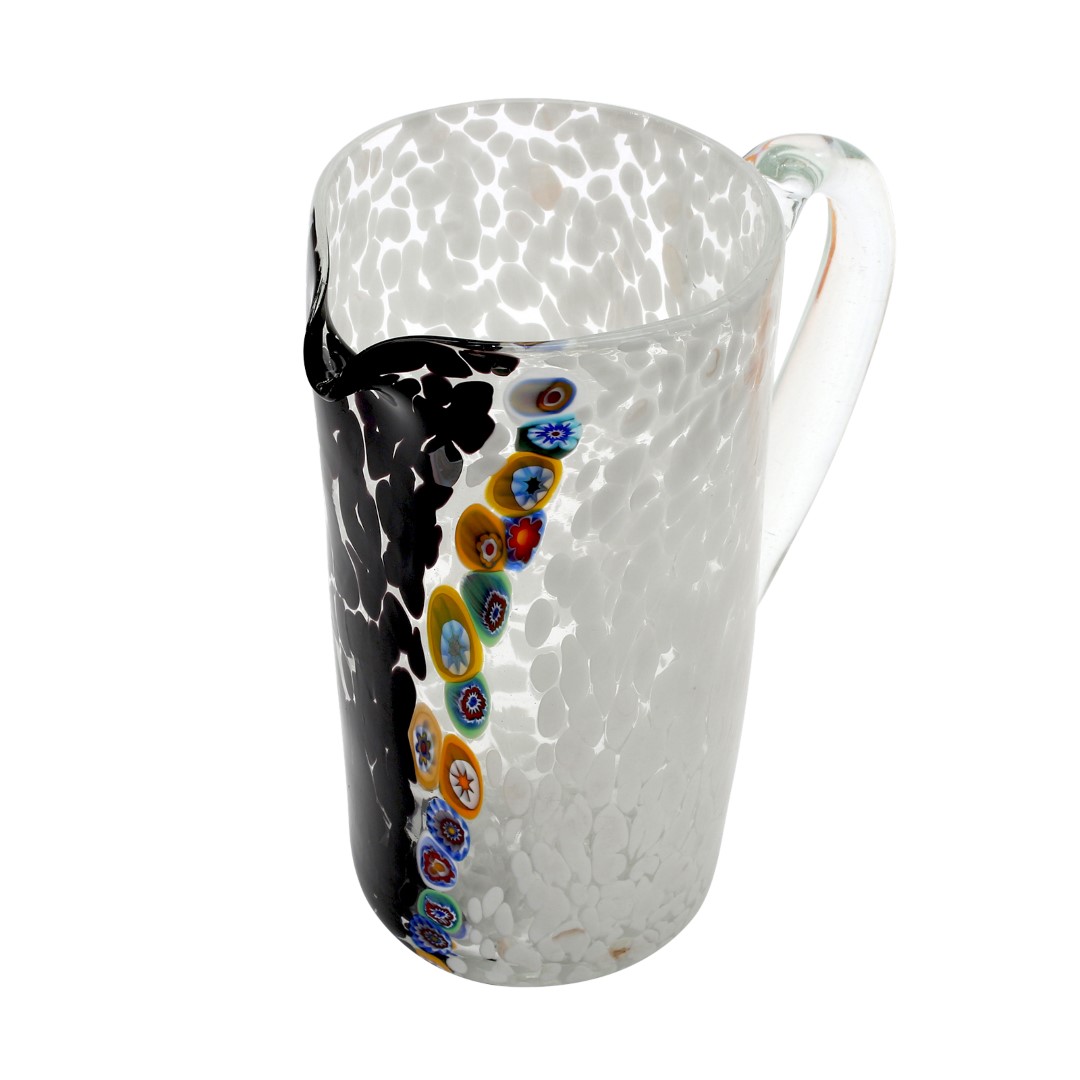 Caraffa in vetro di Murano originale soffiata e decorata con millefiori murrine multicolore e frammenti di vetro colorato. La caraffa è firmata dal maestro vetraio con incisione a freddo.