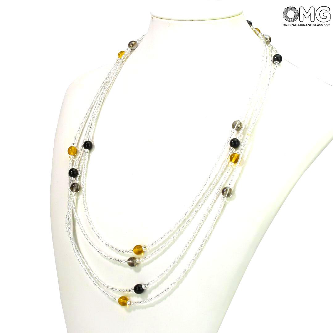 Collana di perle veneziane fatta a mano in vetro di Murano originale. Le perle sono realizzate una a una mediante lavorazione al lume dai nostri maestri vetrai. Esclusiva ed originale idea regalo per donna. Gioiello ideale per essere indossato durante eventi di gala o feste serali.
