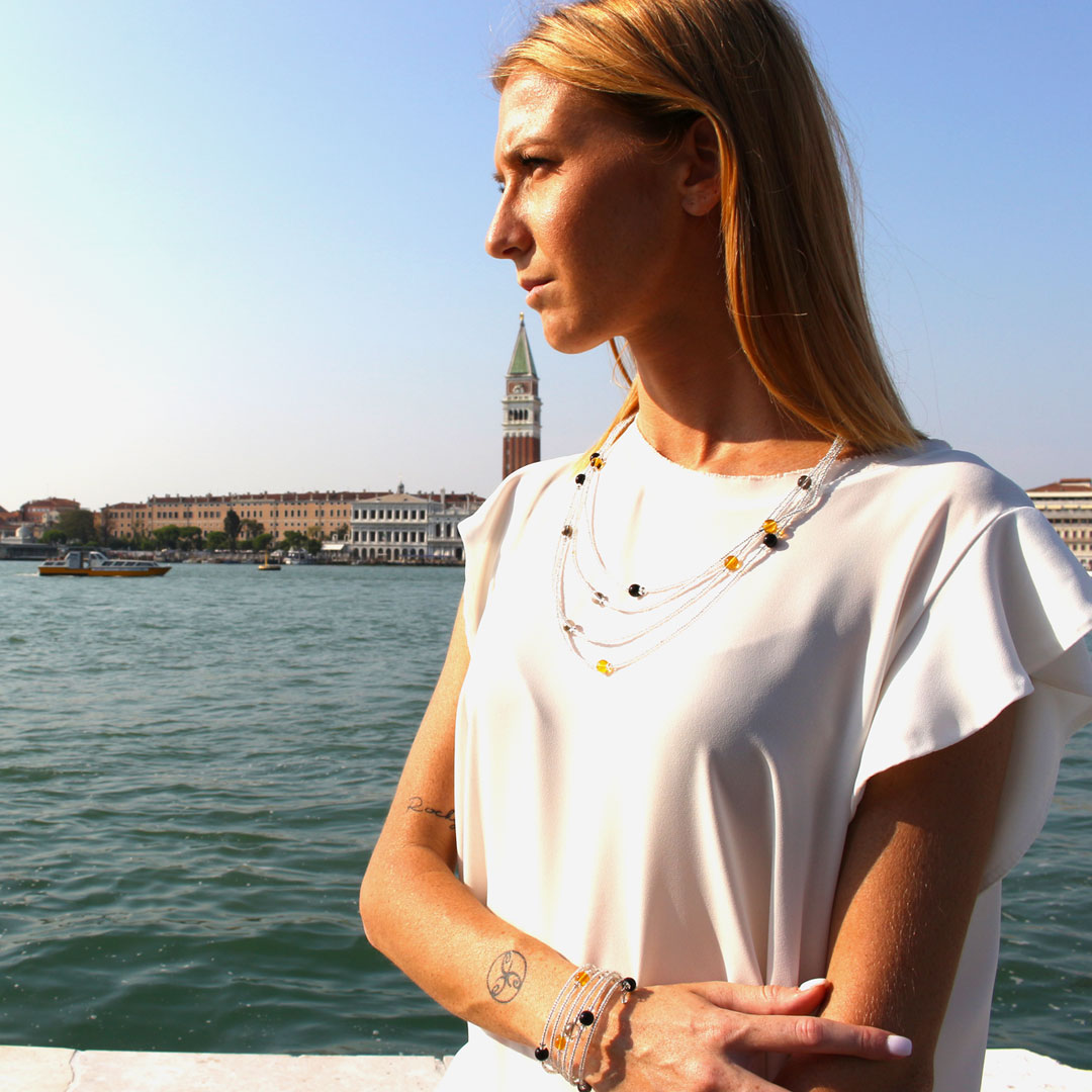 In questo gioiello risalta lo stupendo connubio tra il vetro di murano, le geometrie e gli inserti in argento. Design ricercato e studiato dalle nostre designer.