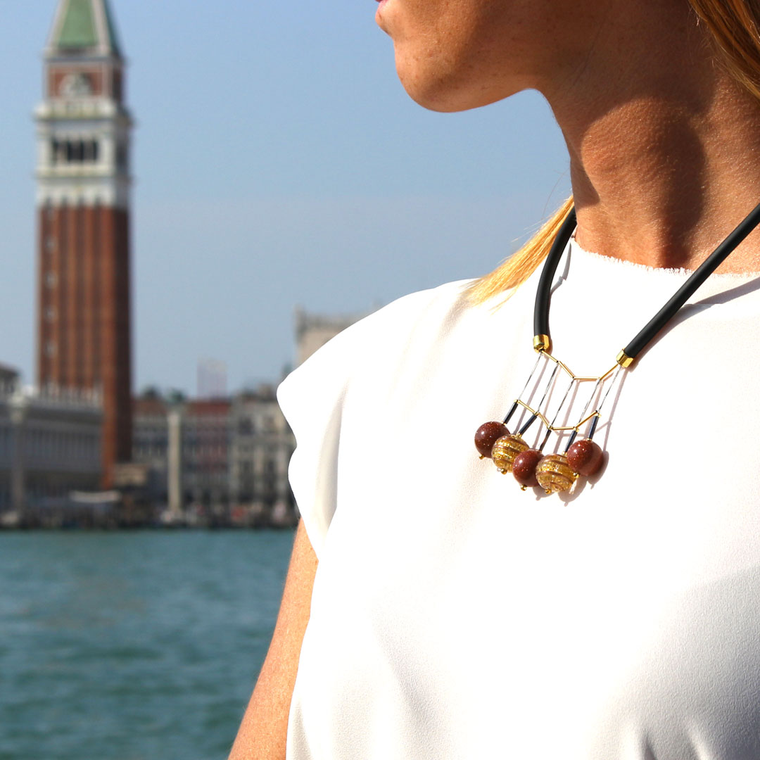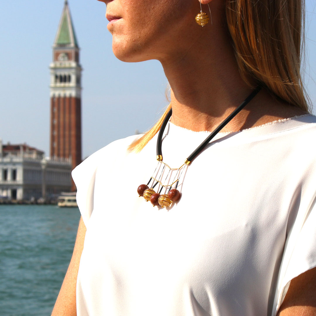 In questo gioiello risalta lo stupendo connubio tra il vetro di murano, le geometrie e gli inserti in oro. Design ricercato e studiato dalle nostre designer.