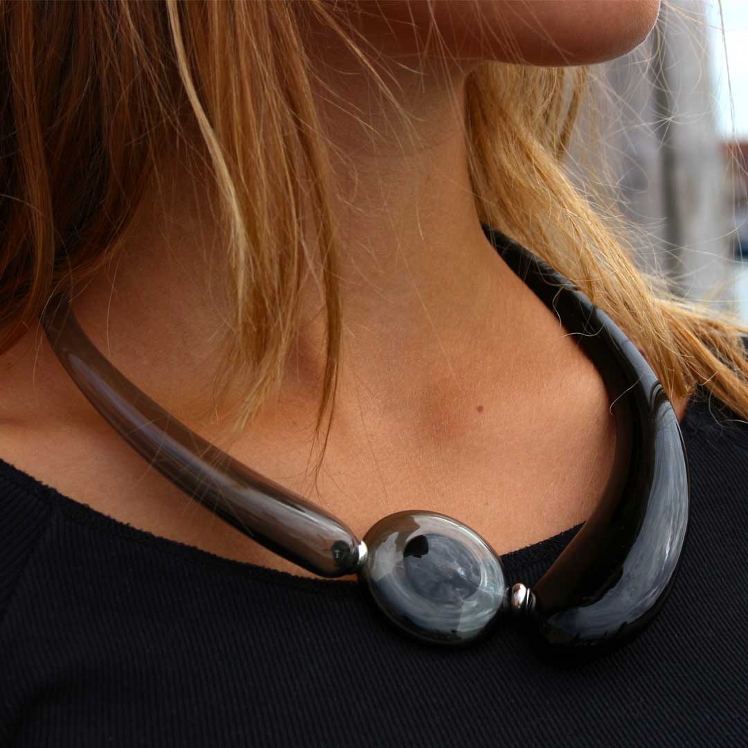 Elegante collana di design in vetro soffiato e lavorata interamente a mano. Opera leggera grazie alla tecnica di lavorazione in vetro soffiato. Per indossarla basta aprire le estremità ed allargare l'elastico interno.