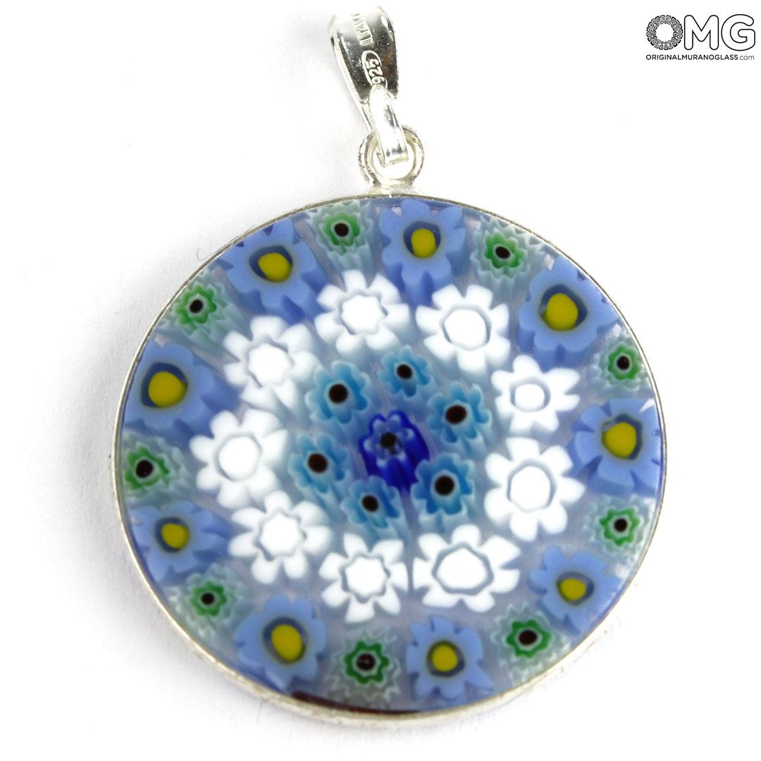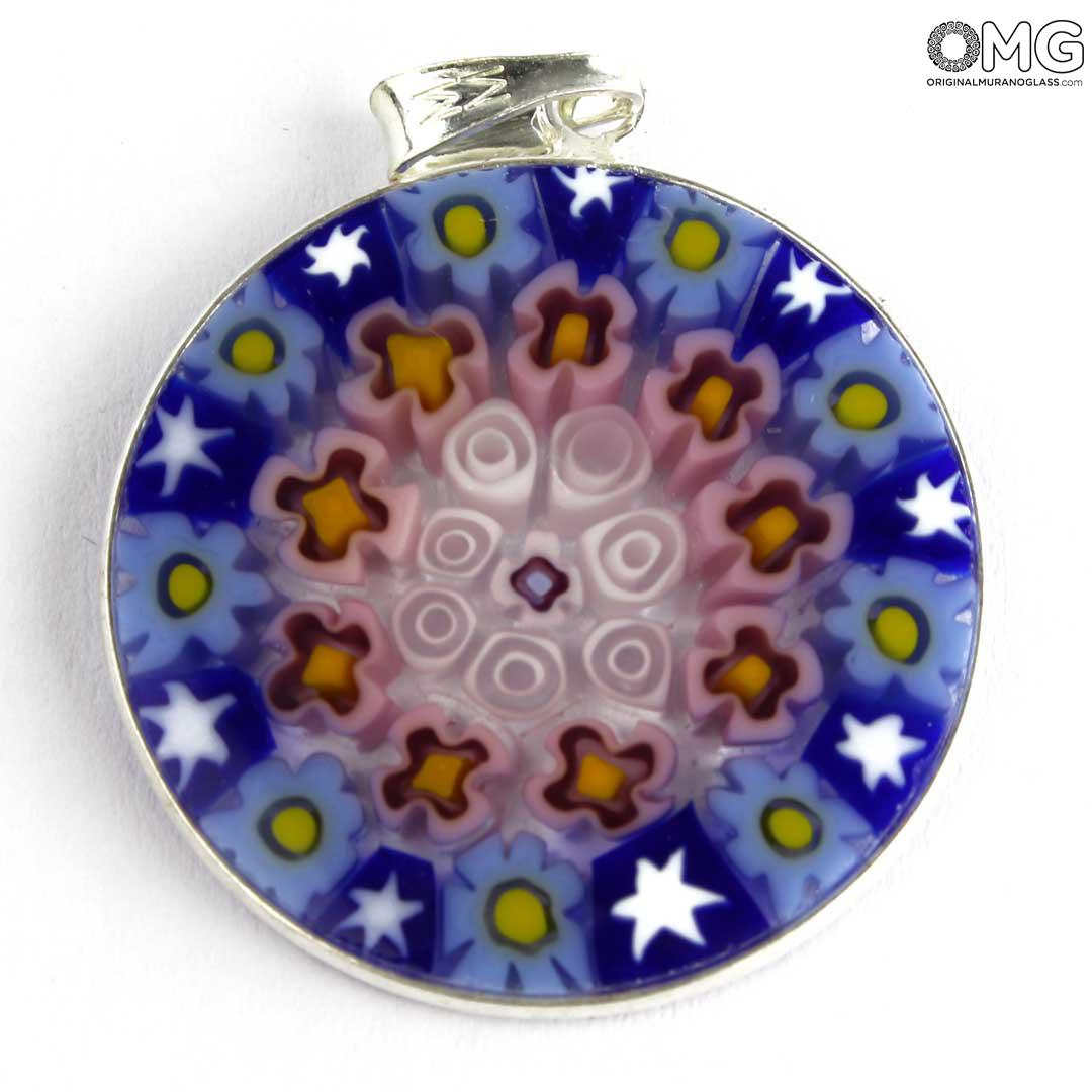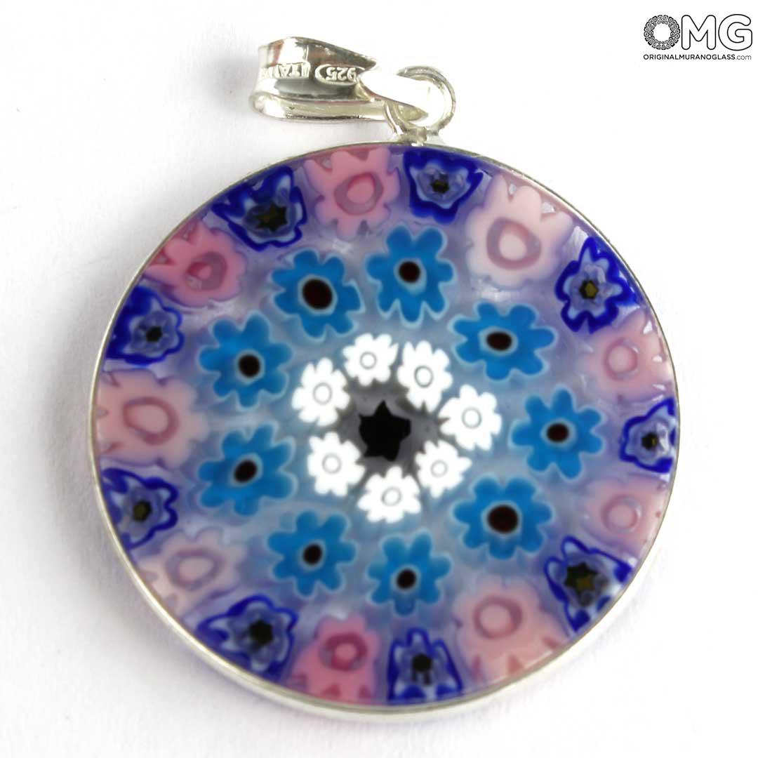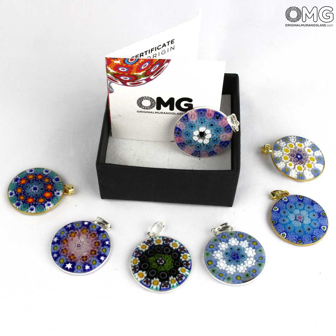 Questo ciondolo è realizzato a mano utilizzando una particolare tecnica della lavorazione del vetro di Murano, i Millefiori, diventati un marchio di fabbrica del vetro di Murano. Questo accessorio in vetro presenta un motivo simmetrico di fiori colorati in tonalità diverse.
