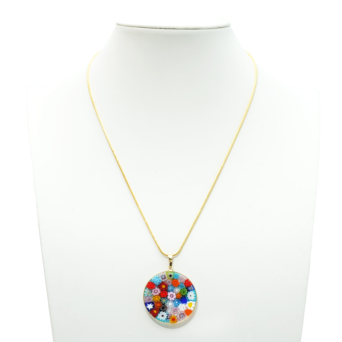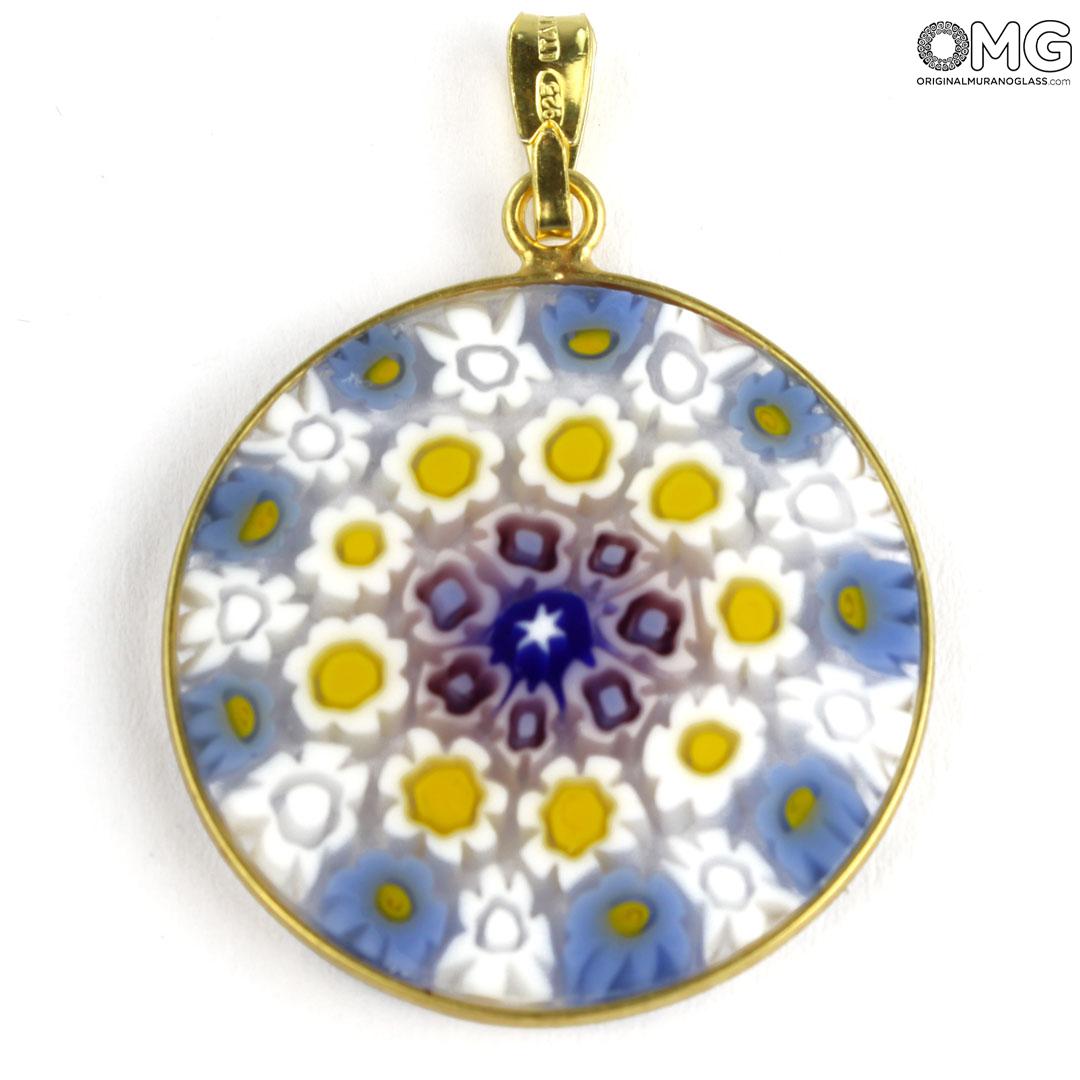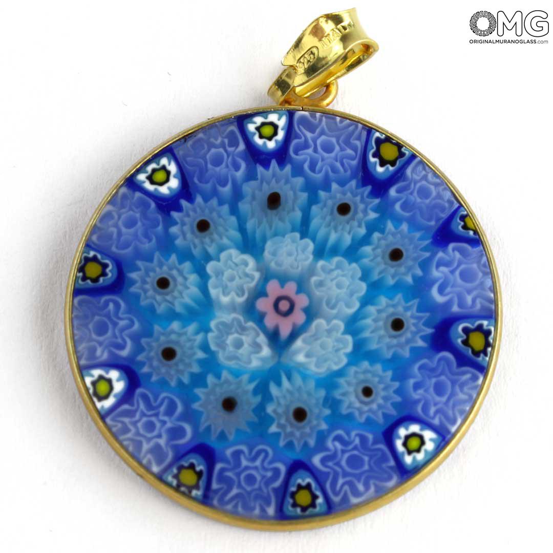 Questo ciondolo è realizzato a mano utilizzando una particolare tecnica della lavorazione del vetro di Murano, i Millefiori, diventati un marchio di fabbrica del vetro di Murano. Questo accessorio in vetro presenta un motivo simmetrico di fiori colorati in tonalità diverse.