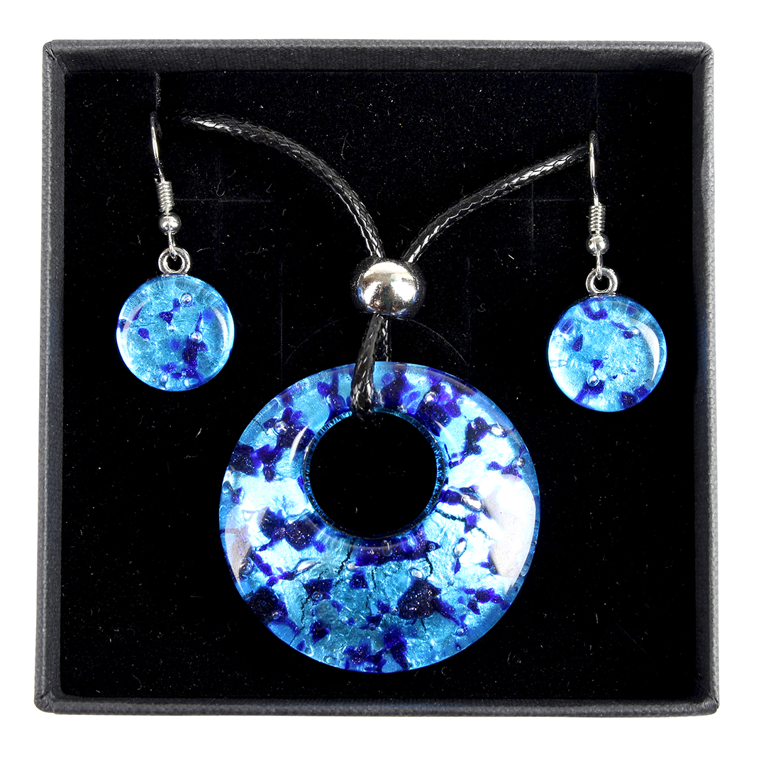 Parure "Cortina Round" in vetro di Murano, realizzata a mano in vetro fusione e arricchita con foglia d'argento.