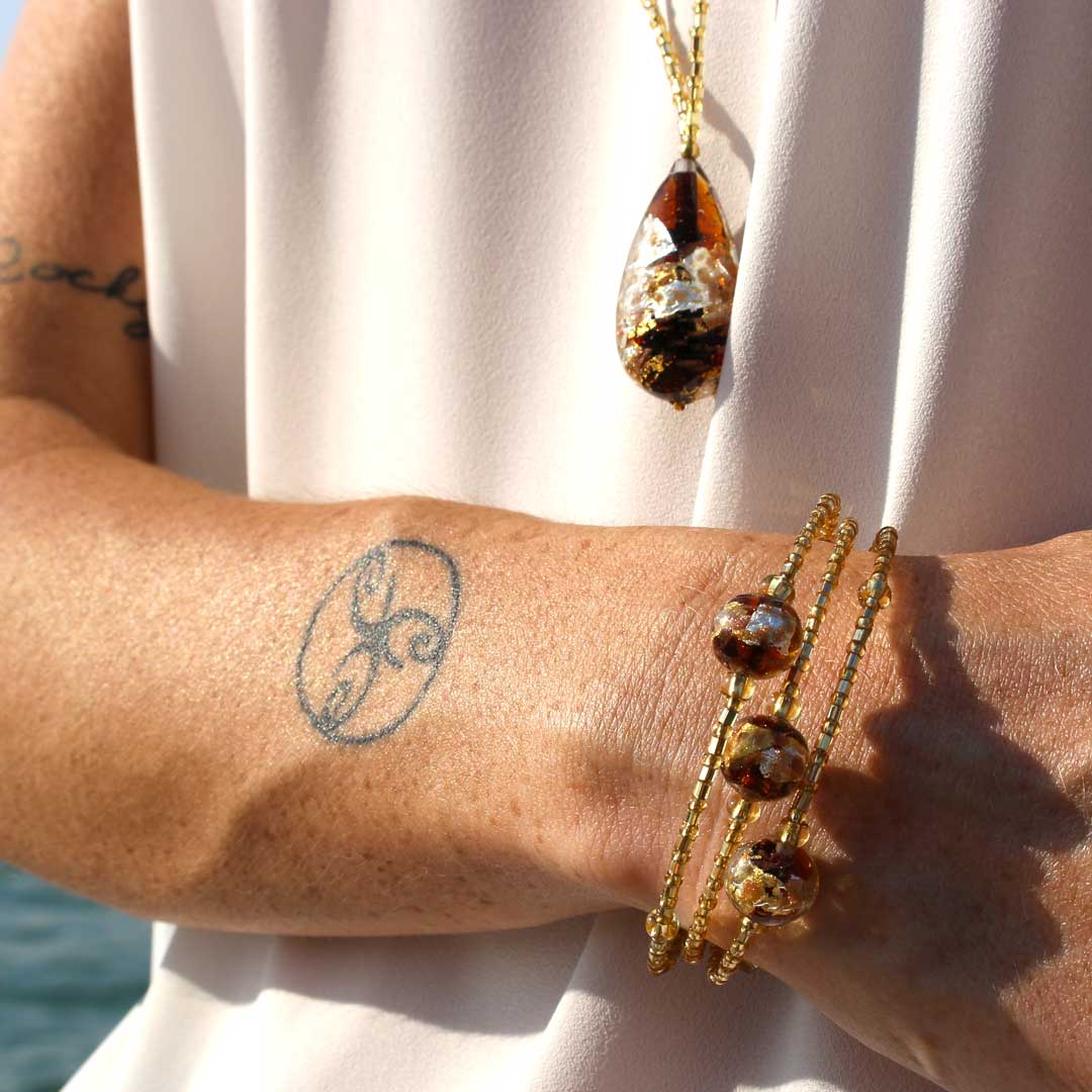 Le perle e i pendenti sono realizzati con vetro di Murano in canna realizzata a Murano, foglia oro 24k, foglia oro bianco e foglia argento di provenienza italiana.