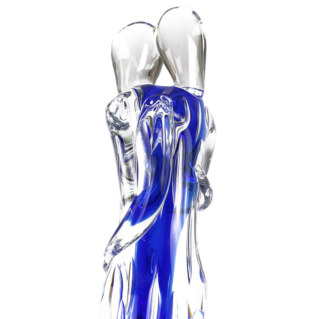 Scultura di figura di amanti abbracciati in vetro lavorato a mano libera e satinato a freddo.