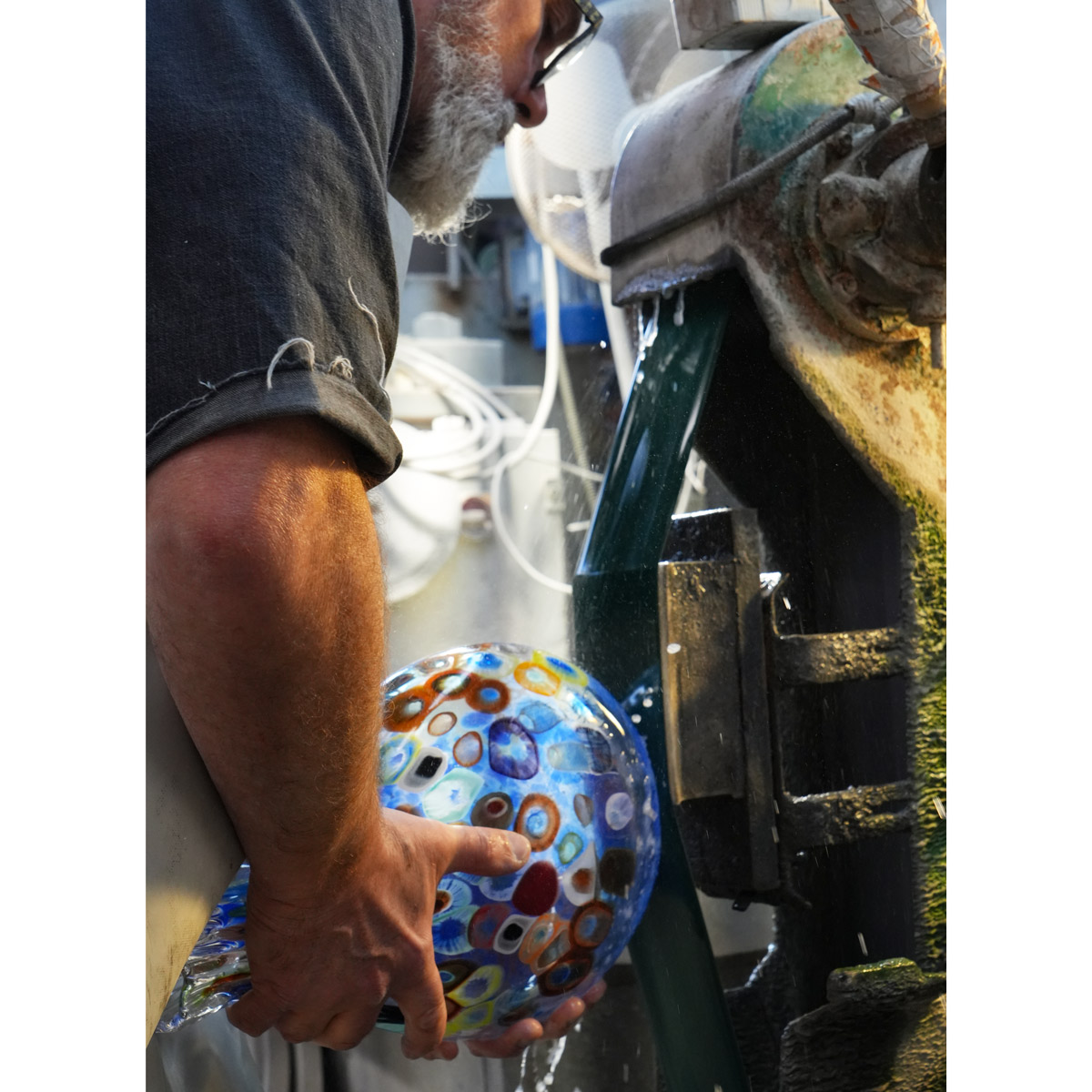Questo vaso soffiato in vetro di Murano è realizzato con una tecnica diffusa nella lavorazione artigianale muranese Vaso in autentico vetro di Murano realizzato a mano nella nostra fornace Original Murano Glass (OMG), decorato con murrine colorate incorporate nel corpo del vetro. La forma elegante, con base morbida e panciuta e collo slanciato, è valorizzata da una trasparenza lattiginosa dai riflessi acquamarina, attraversata da una vivace pioggia di murrine multicolori. Ogni vaso è un pezzo unico: piccole variazioni di colore e disposizione delle murrine sono il segno della lavorazione artigianale. Perfetto come protagonista su un tavolo o una consolle, sia da solo come scultura in vetro, sia con fiori.