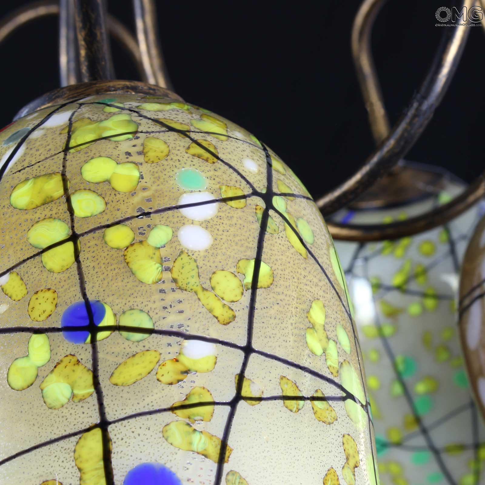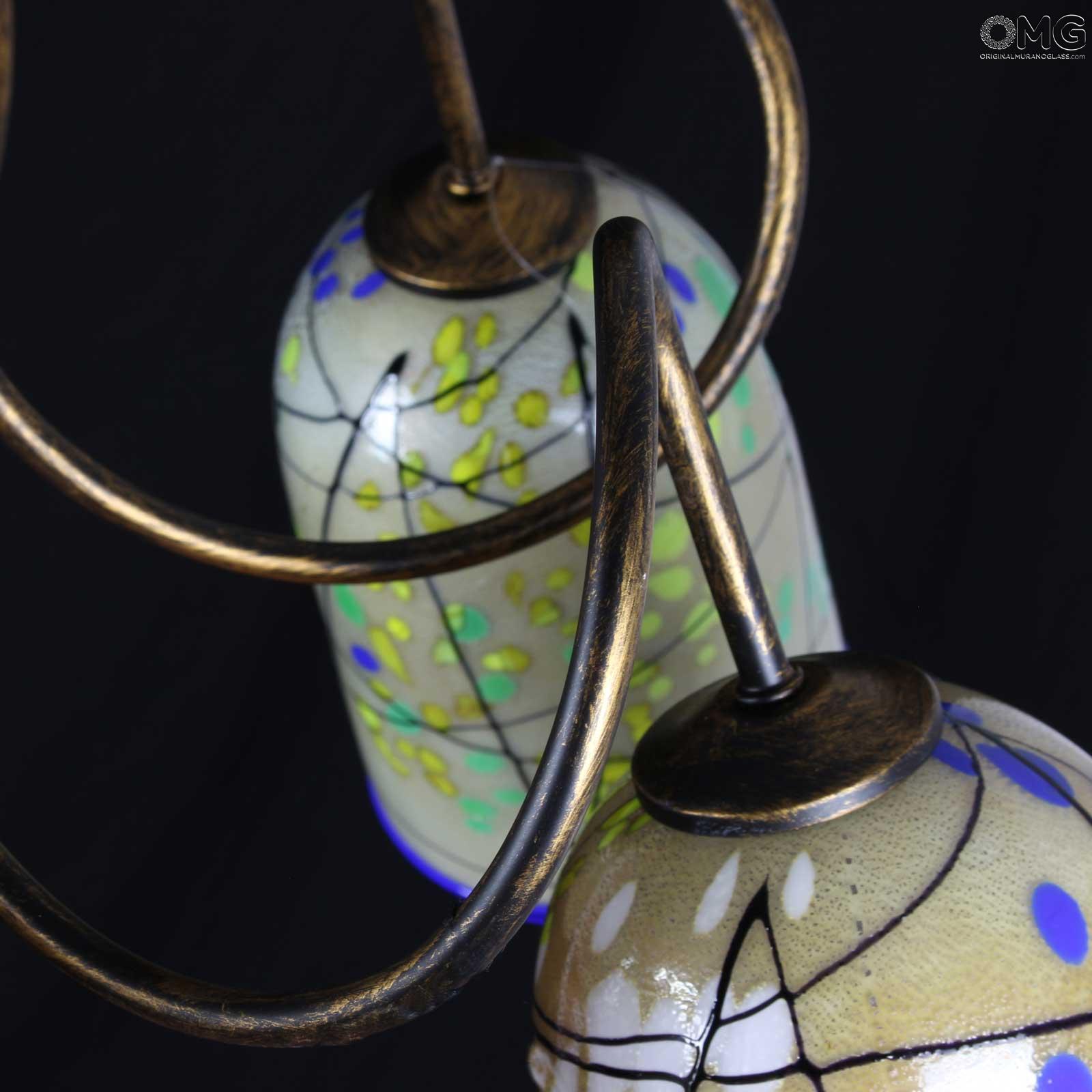 Bellissimo lampadario stile Kandinsky in vetro di Murano originale soffiato con decori in canna e mille fiori, in puro argento. Lampadario a sospensione con catena a 3 luci, montatura cromo in foto, tazze portalampada in vetro artistico con murrine millefiori e canne vitree colorate. Le tazze sono disponibili in vari colori vari: rosso, ambra, azzurro, nero, verde, blu.