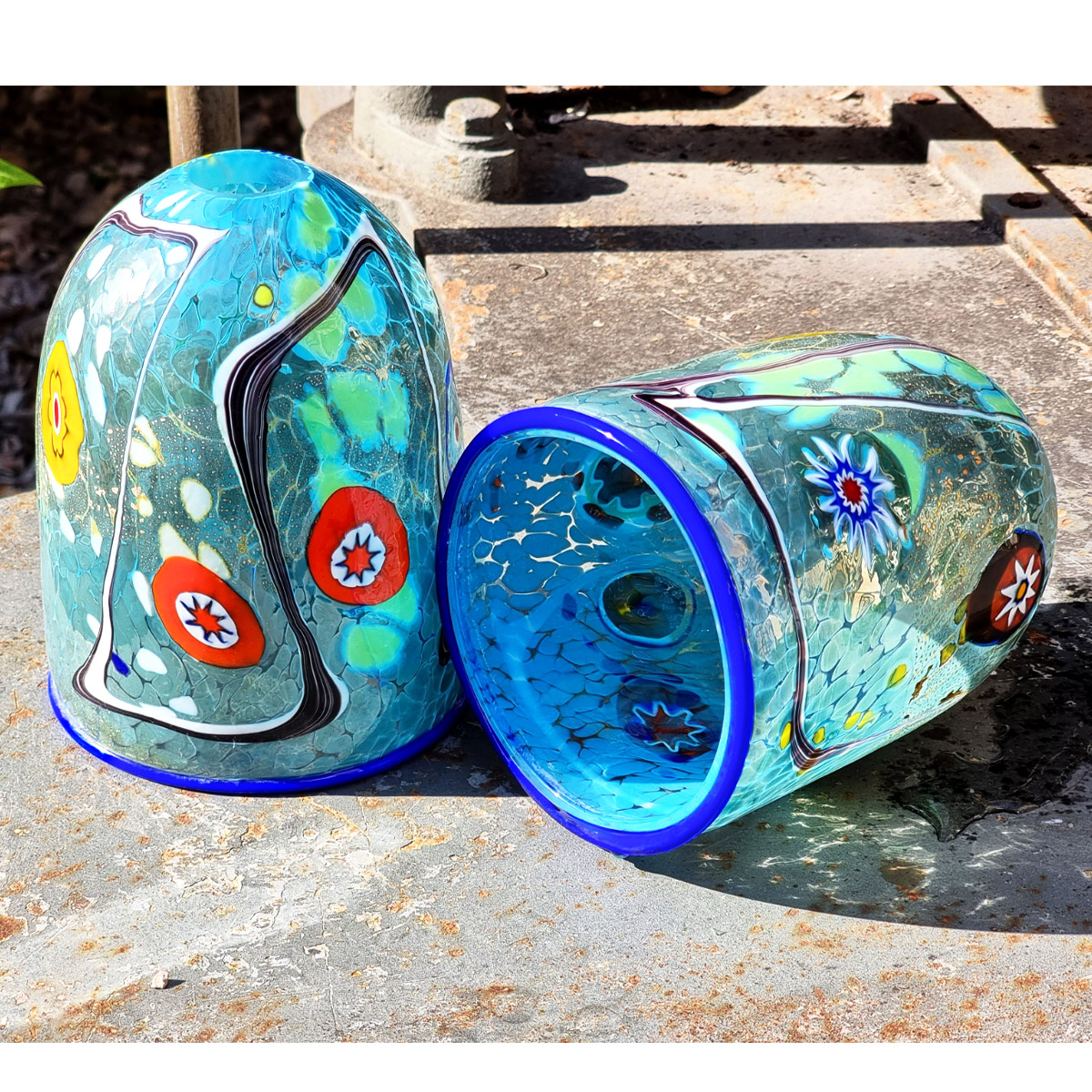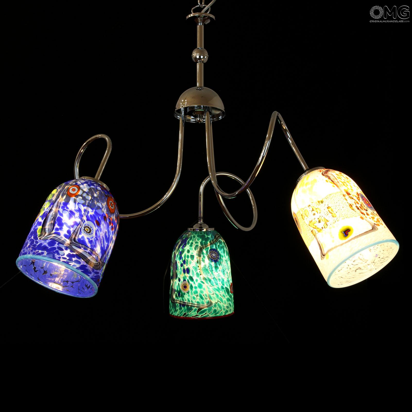 Bellissimo lampadario in vetro di Murano originale soffiato con decori in canna e mille fiori. Lampadario a sospensione con catena a 3 luci, montatura cromo in foto, tazze portalampada in vetro artistico con murrine millefiori e canne vitree colorate. Le tazze sono disponibili in vari colori vari: rosso , giallo, arancione, bianco, verde, blu. La montatura è cromata.