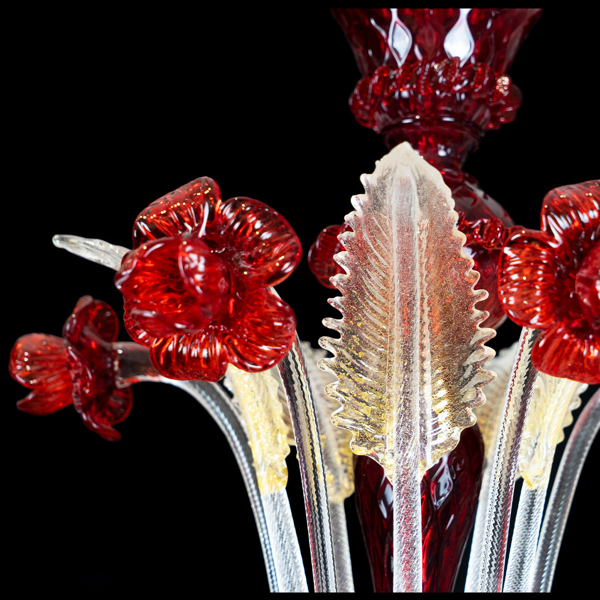 Lampadario veneziano rosso e oro, con oro 24 carati.