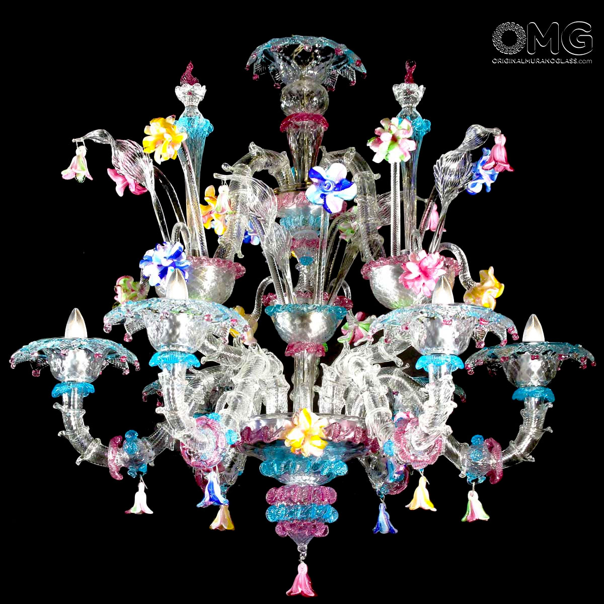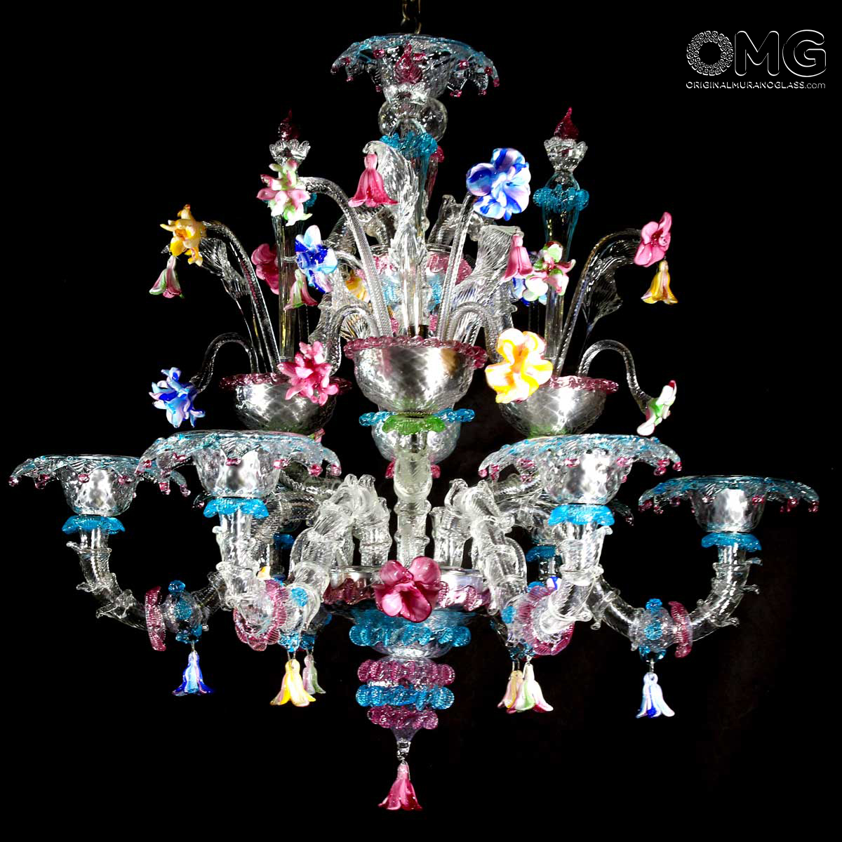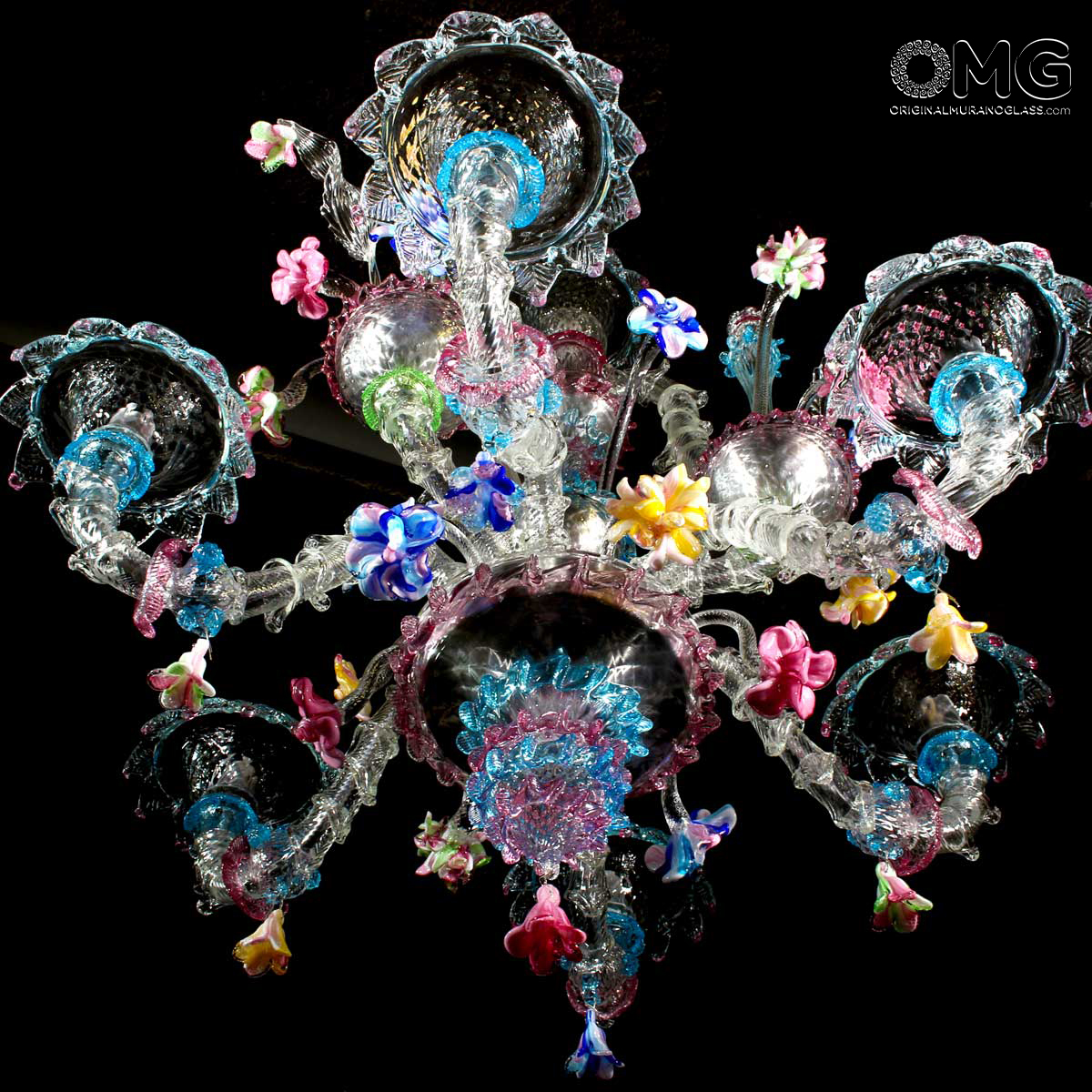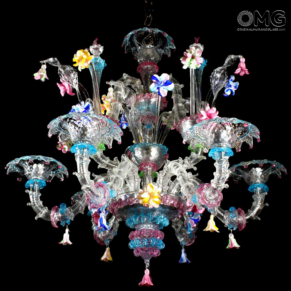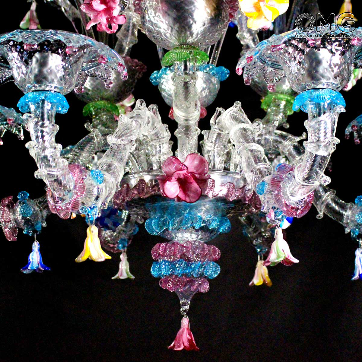 Lampadario Rezzonico, vetro artistico originale di Murano color cristallo con dettagli colorati e fiori in pasta vitrea