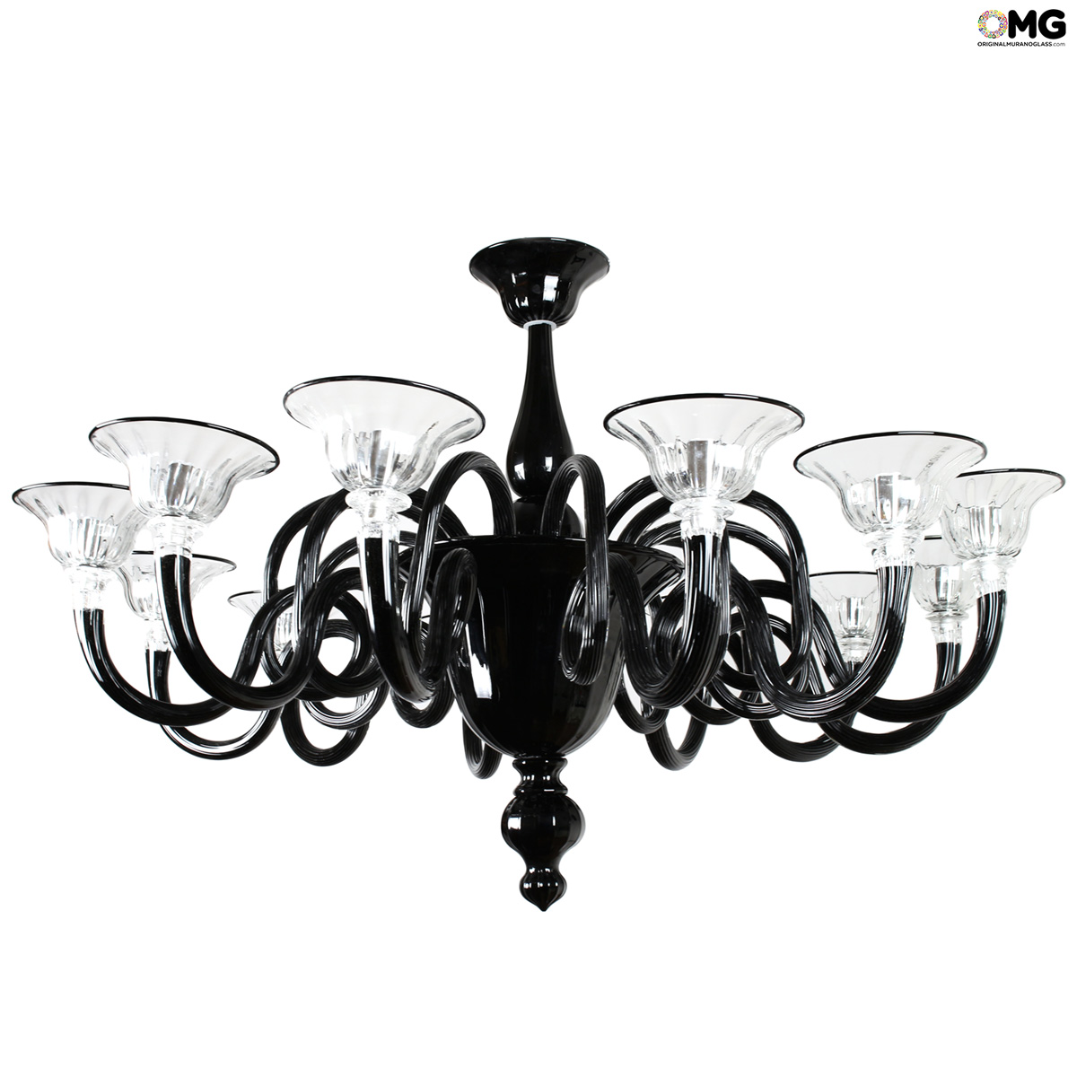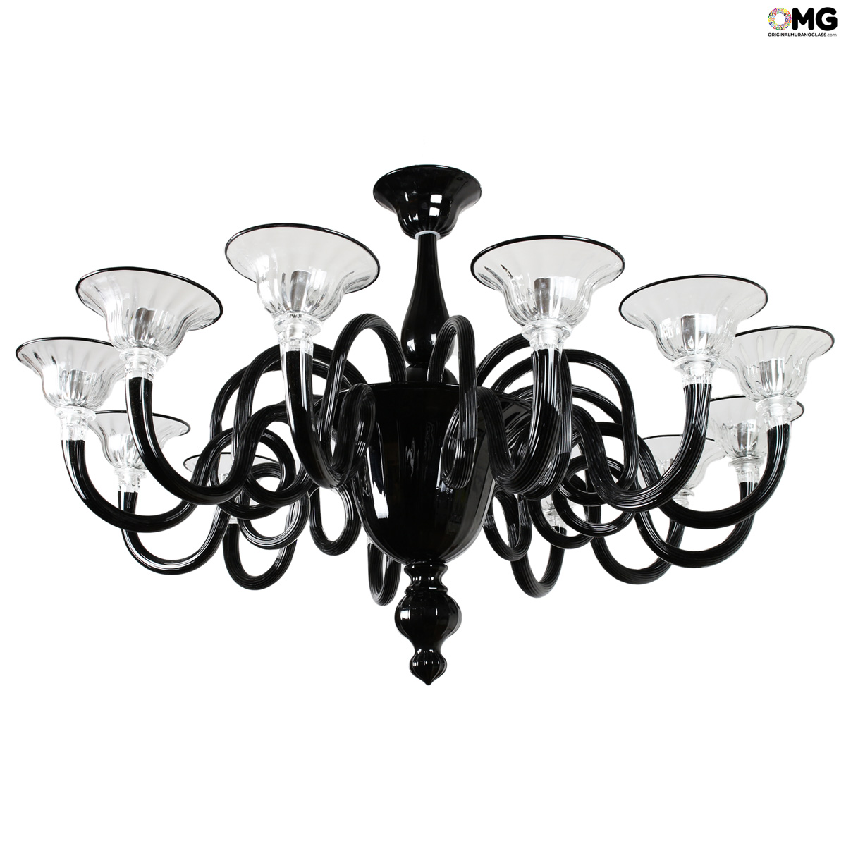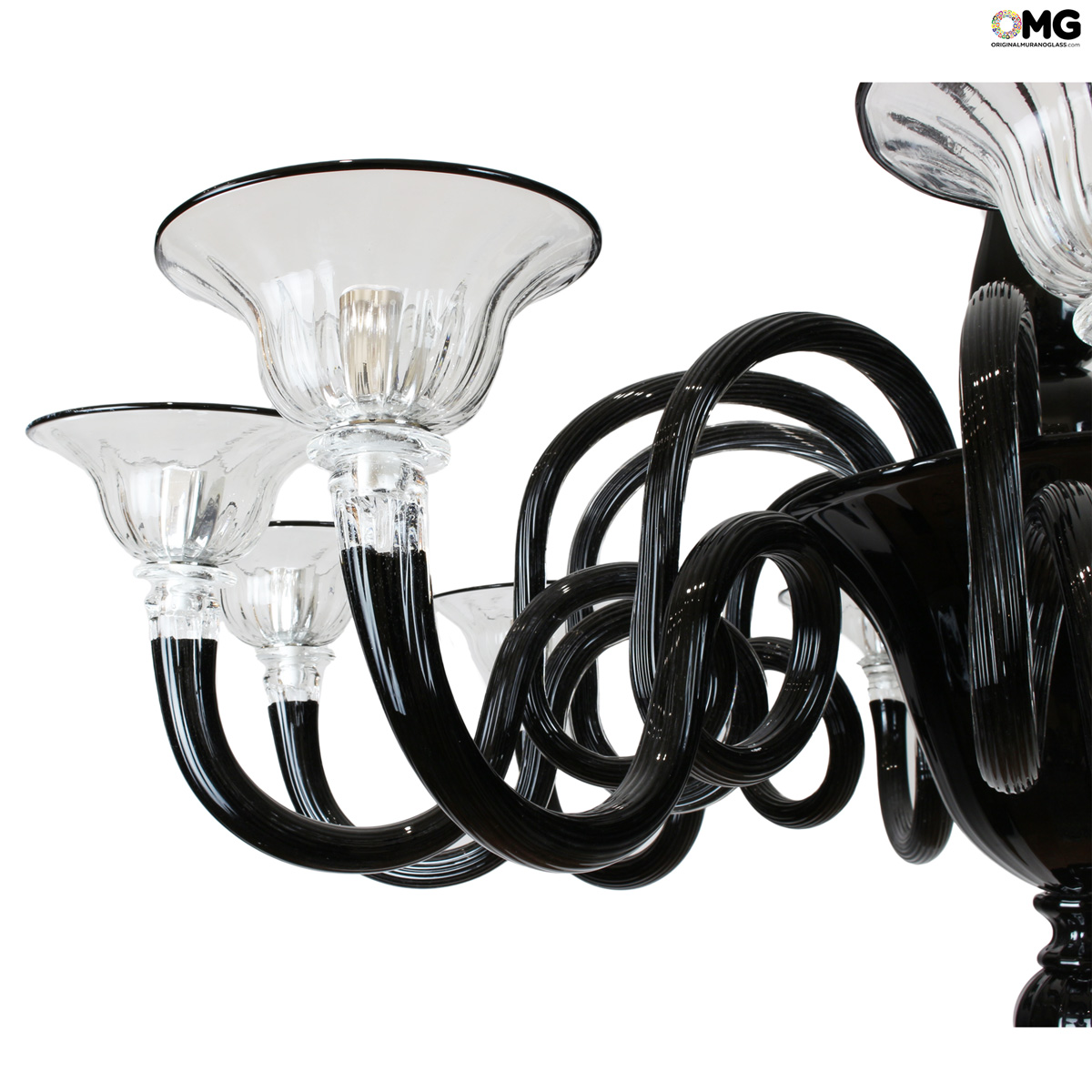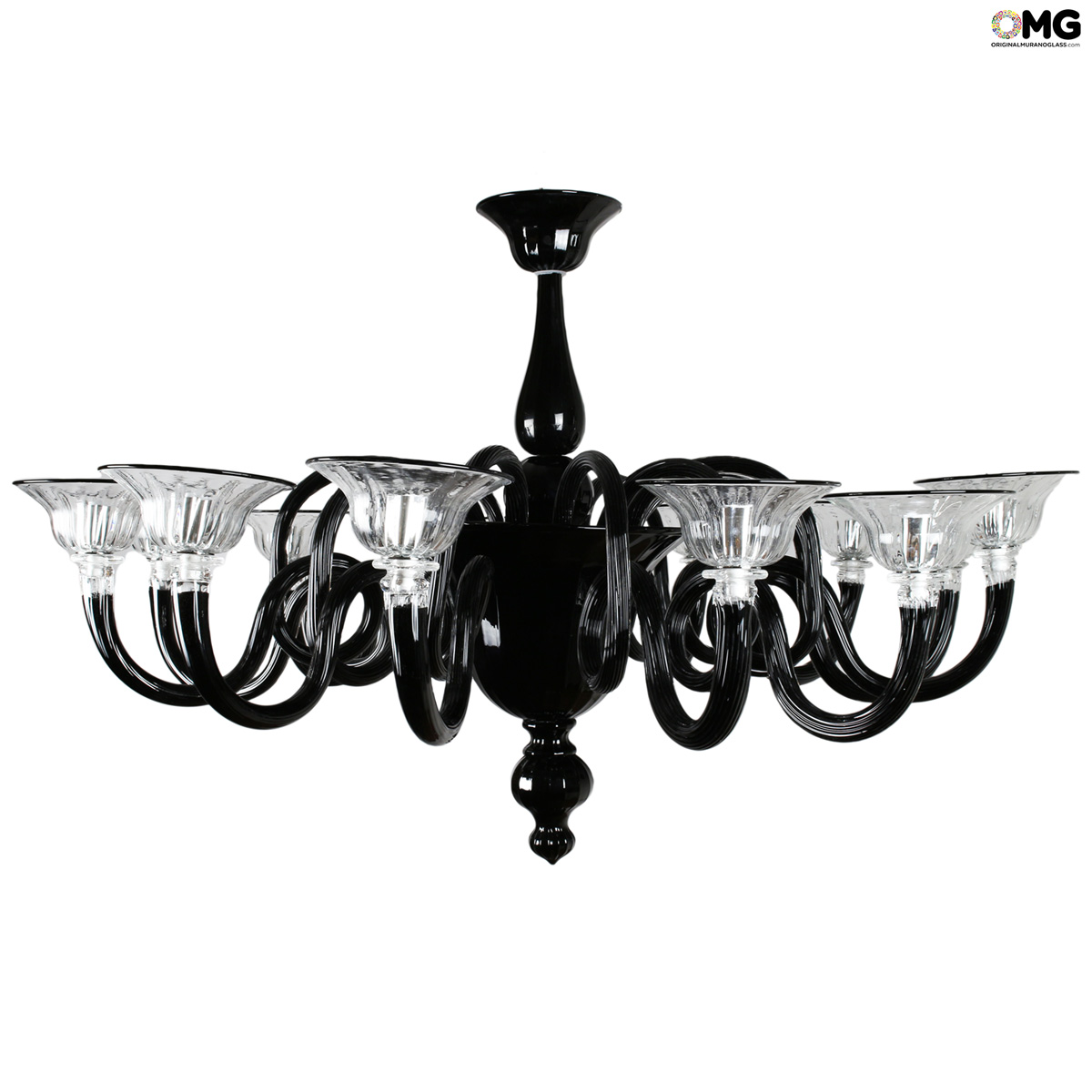 Lampadario veneziano a 12 luci color nero in pasta, originale in vetro di Murano.