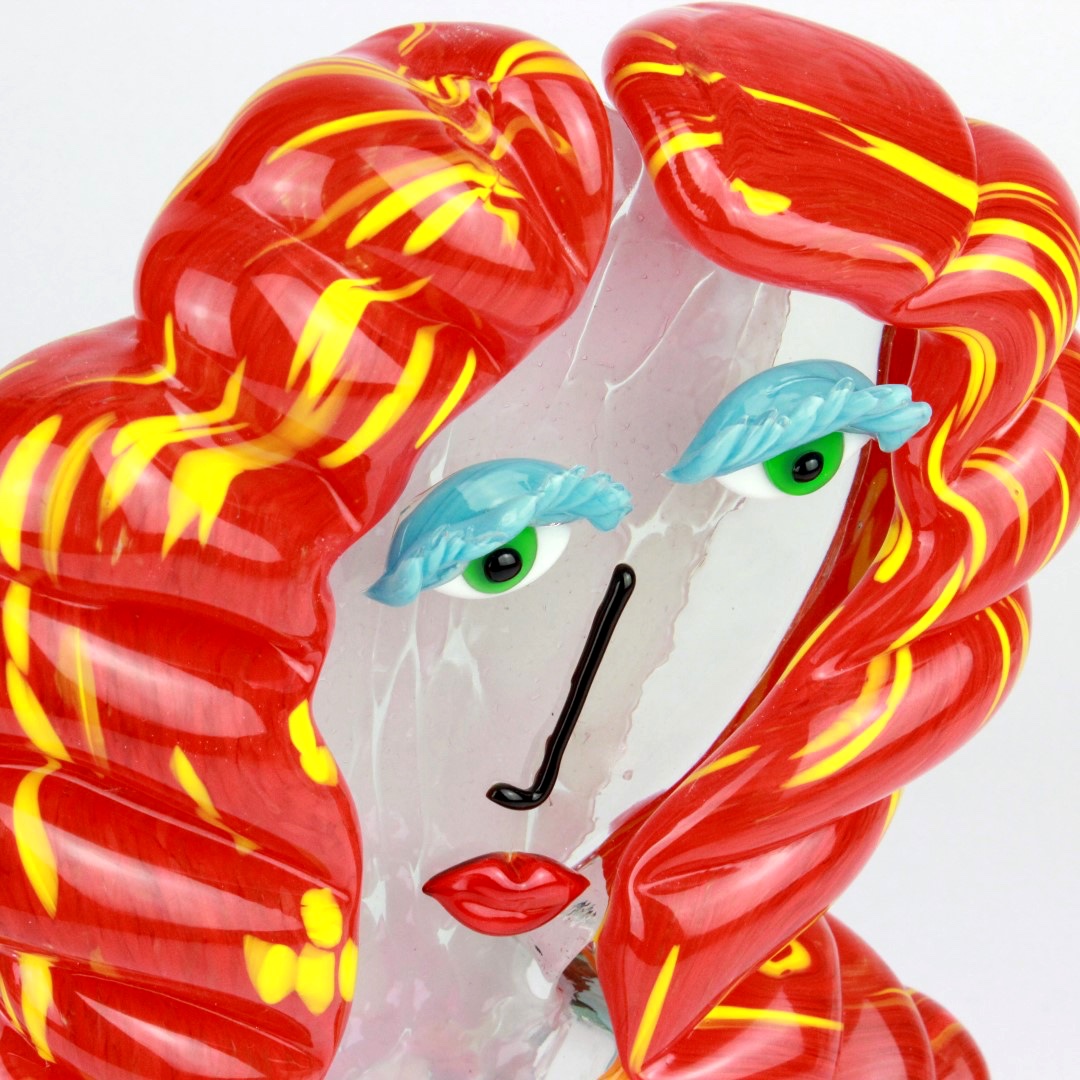 Scultura astratta con design moderno. L'oggetto rappresenta la testa di una donna con lunghi capelli ricci. La scultura in vetro originale di Murano è realizzata in parte a mano libera con modellazione a caldo e in parte con fusione del vetro. Soggetto astratto-moderno. Sfumature di colori molto forti e di impatto visivo. Molata e lucidata a mano. Firmata dal maestro con incisione a freddo.